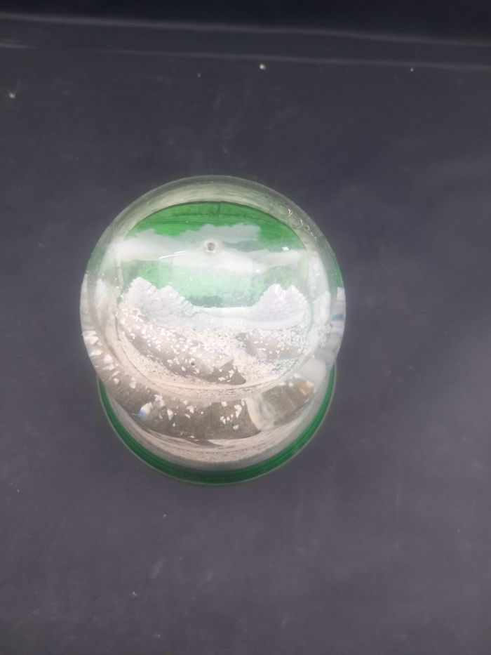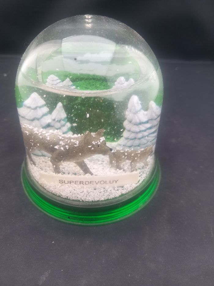 Boule à neiges Matière plastique Avec des loups Couleurs vert, blanc, gris et noir Marqué Superdevoluy En très bon état Dimensions approximative : Hauteur 9cm : 8cm de diamètre Poids 250g