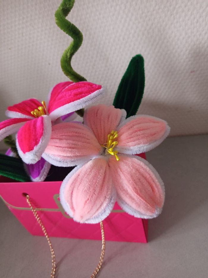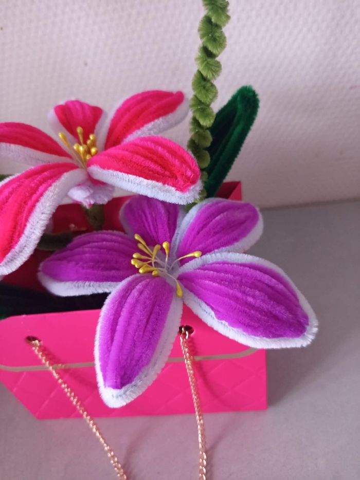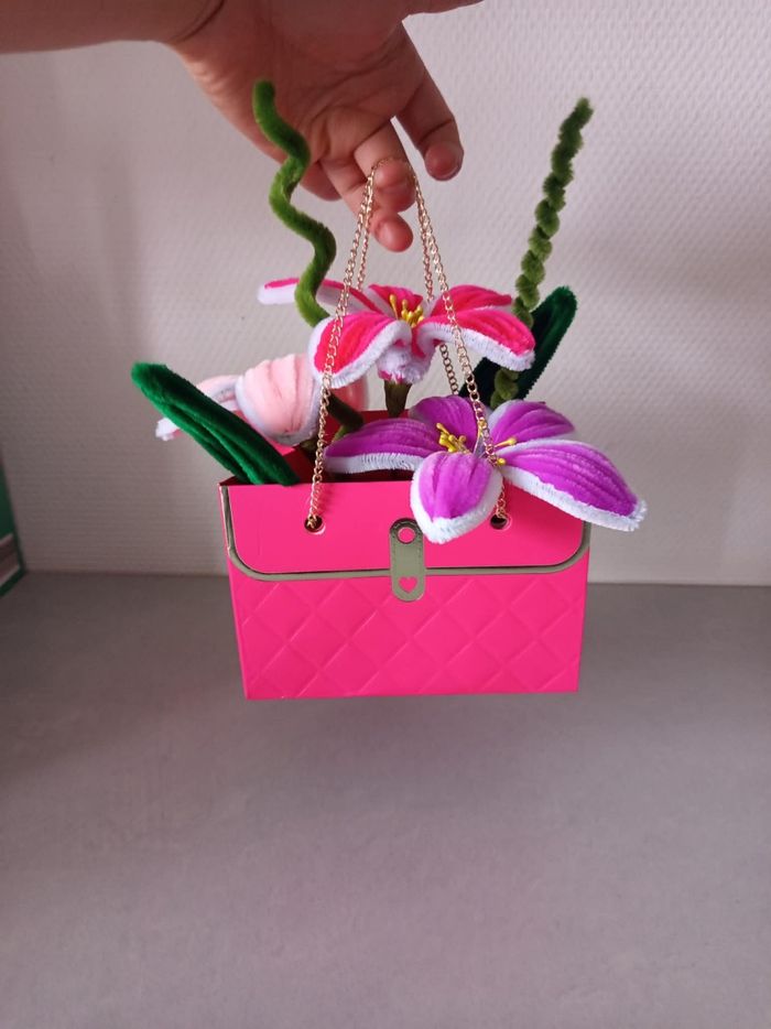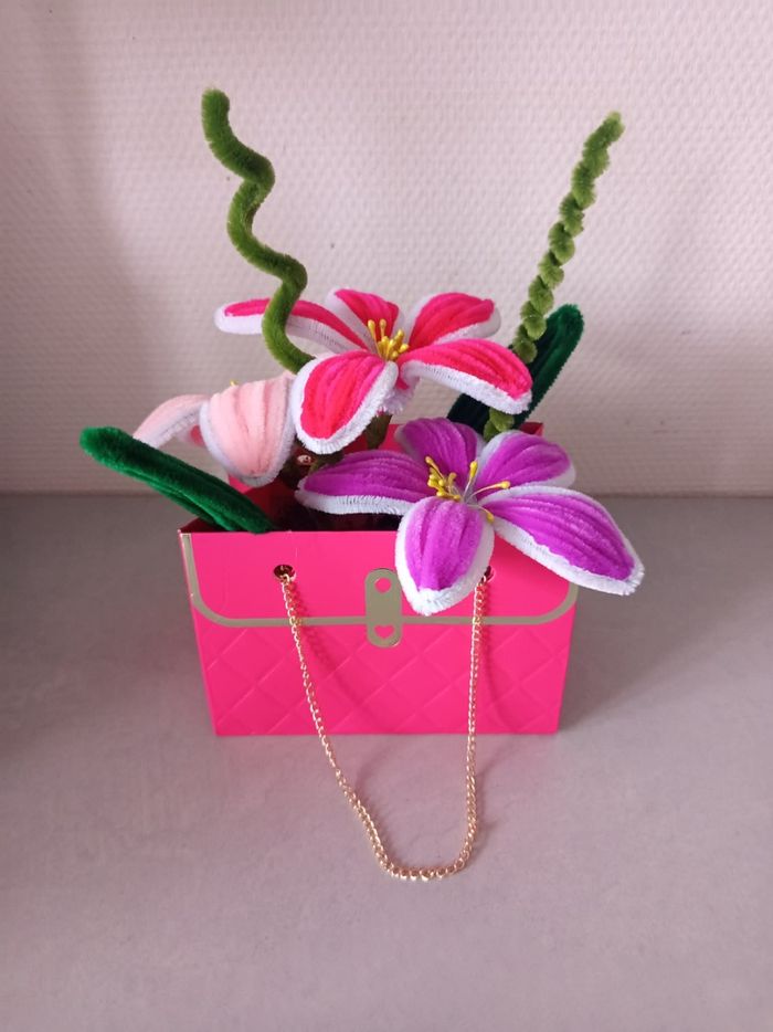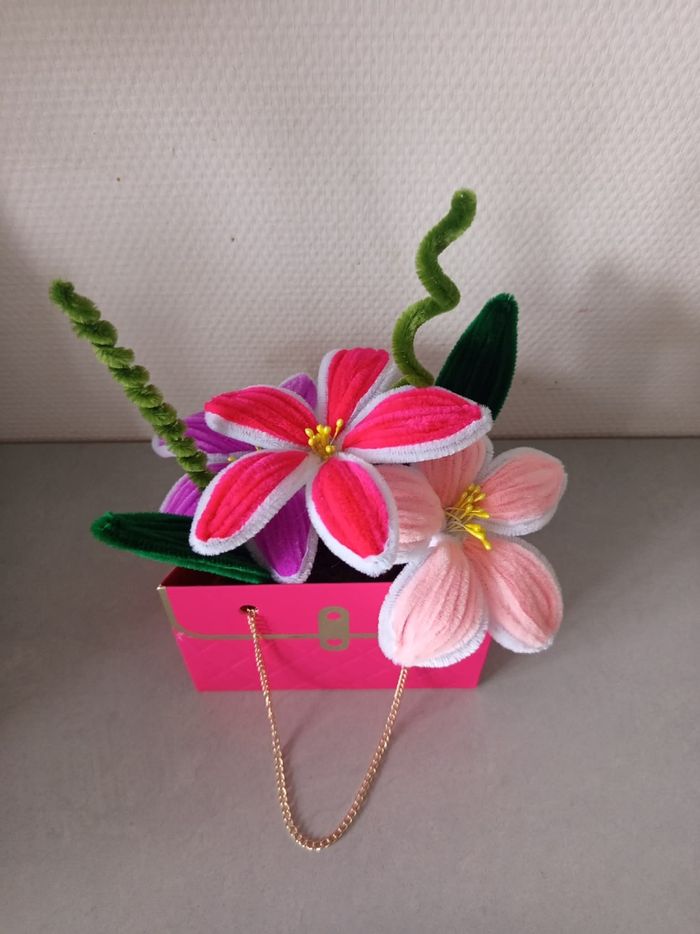 Composition florale décorative réalisée à la main avec des chenillettes (cure-pipe), présentée dans une jolie boîte rose avec chaîne dorée ✨ Un objet unique et créatif, idéal pour une décoration originale ou pour offrir. 🌸 Création faite main avec soin 🎨 Couleurs douces et harmonieuses 💝 Modèle unique 🎁 Parfait comme cadeau ✨ Objet déco tendance et poétique Chaque pièce est réalisée artisanalement, ce qui rend chaque création unique. N’hésitez pas à me contacter pour plus d’informations. Envoi possible ou remise en main propre.