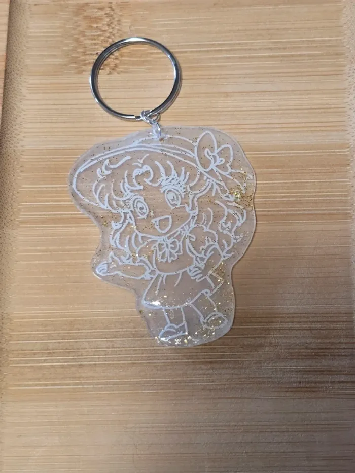 Porte clé avec personnage dessiné en blanc style Lady Georgie avec quelque paillettes dorée #chibi #chibigirl #paillette #faitmain #ladygeorgie #georgie #shojo
