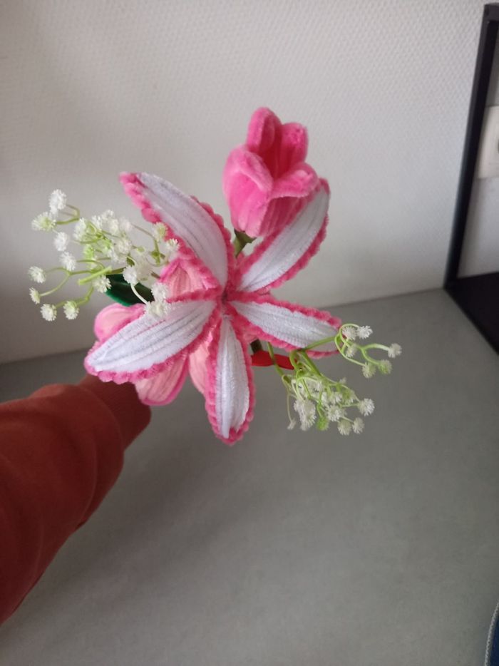 Joli petit bouquet décoratif réalisé à la main avec des chenillettes (cure-pipe) et fleurs décoratives. Déjà emballé, il est prêt à être offert pour une occasion spéciale ou simplement pour faire plaisir 💝 🌸 Création faite main avec soin 🎁 Déjà emballé (cadeau prêt) 🎨 Tons rose et blanc doux 💎 Modèle unique ✨ Durable (ne fane pas) Idéal pour un anniversaire, une fête, ou une petite attention. N’hésitez pas à me contacter pour plus d’informations. Envoi possible ou remise en main propre.
