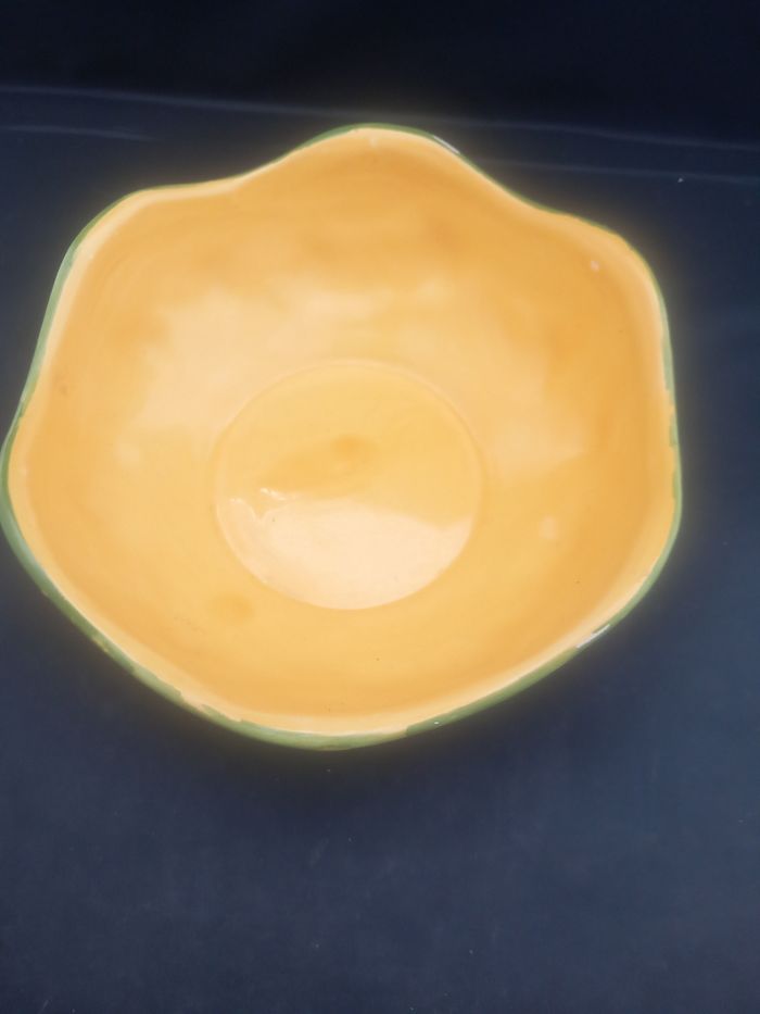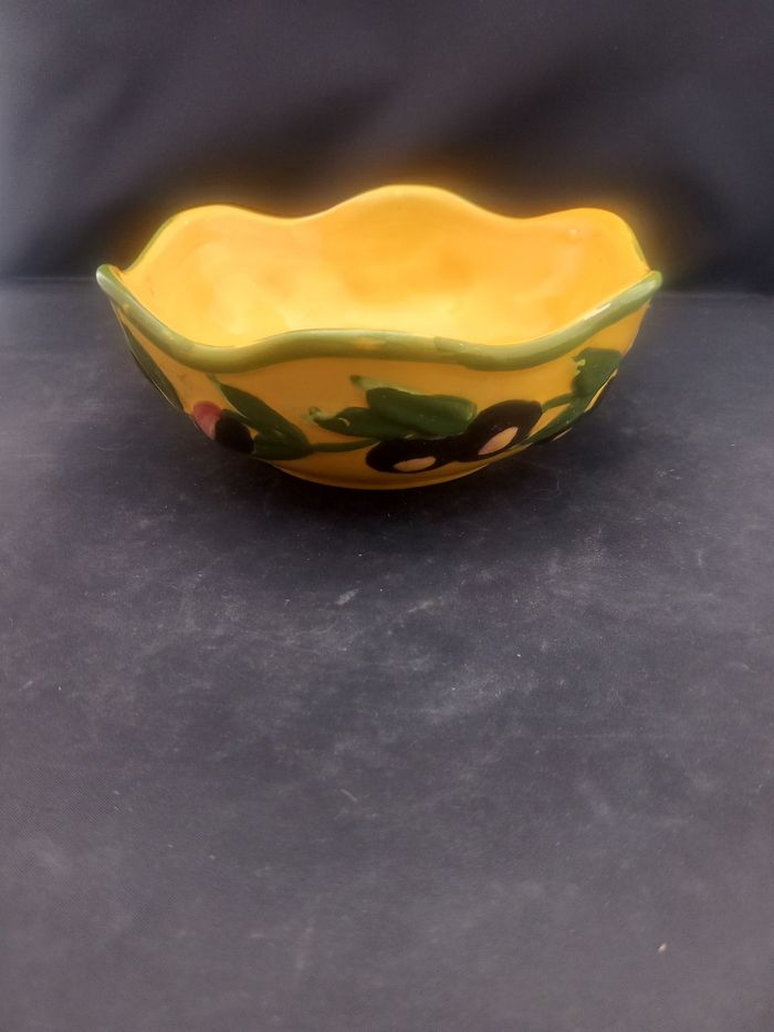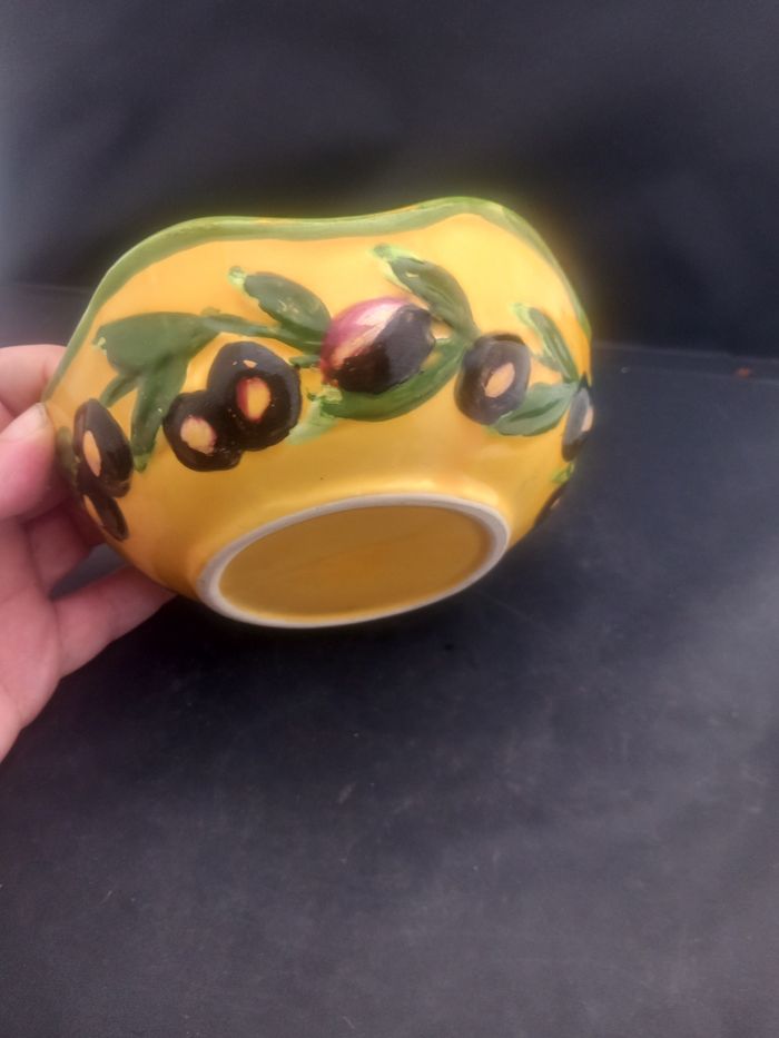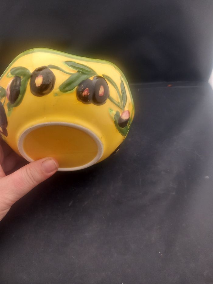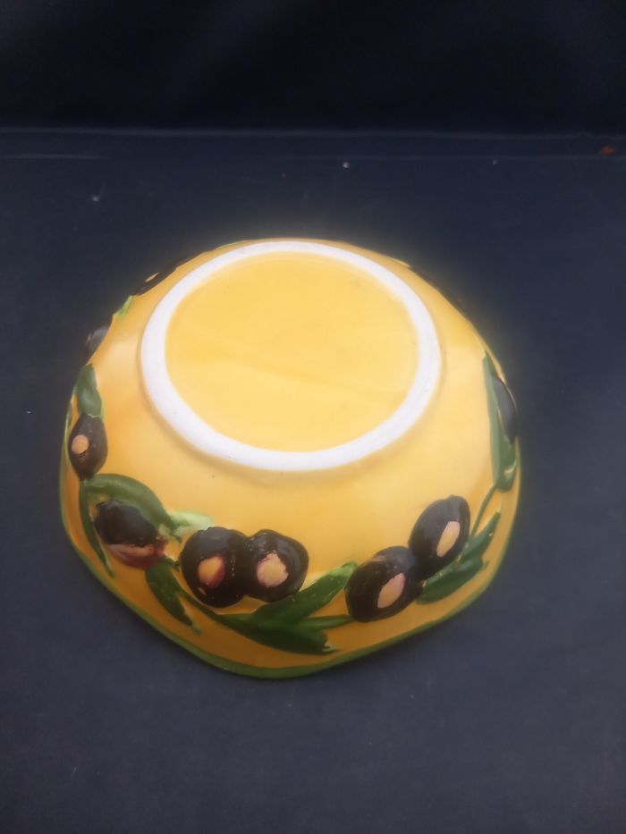 Petit saladier pour apéritif Matière céramique Motifs olives Couleurs vert, jaune, marron et noir En bon état Dimensions approximative : Hauteur 5cm : 14,5cm de diamètre Poids 200g