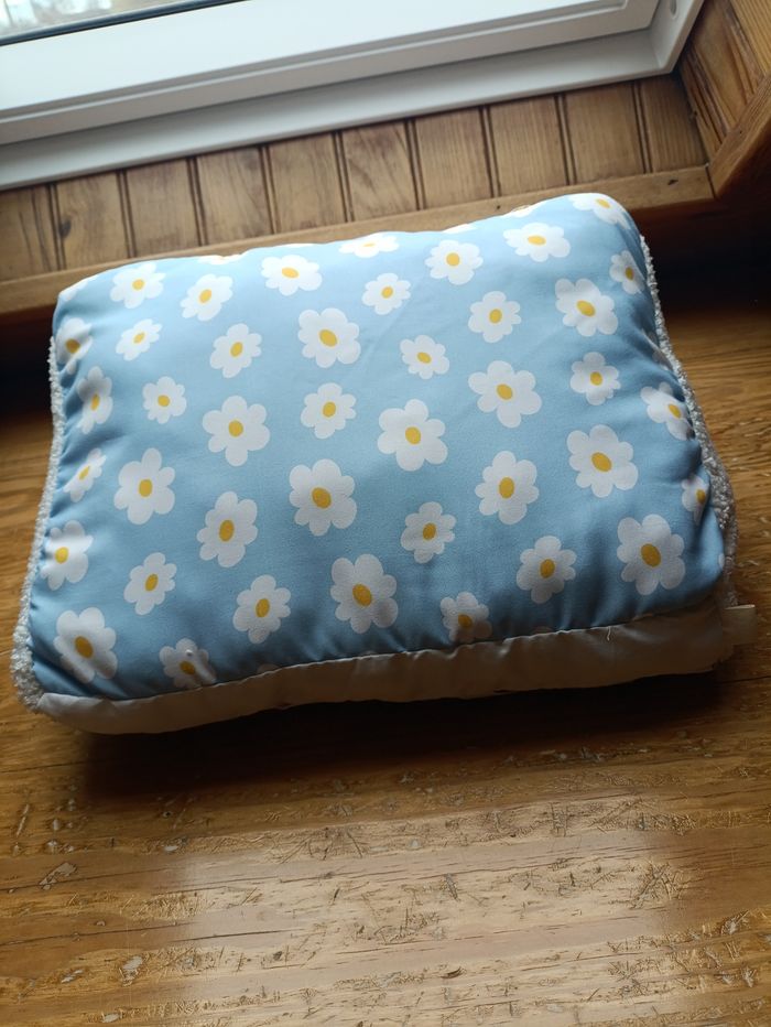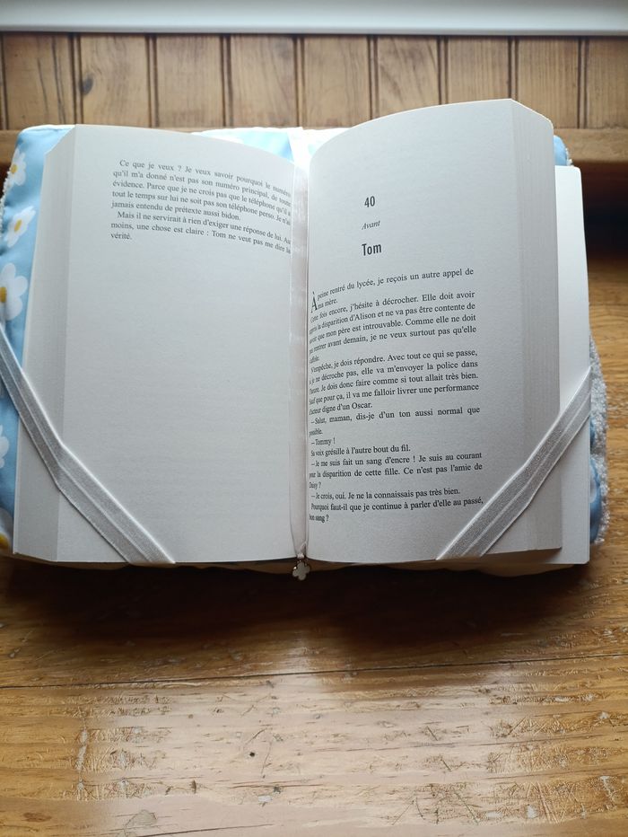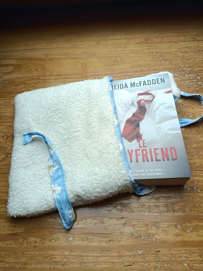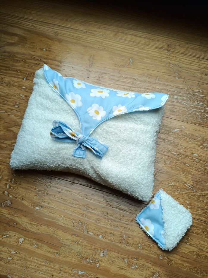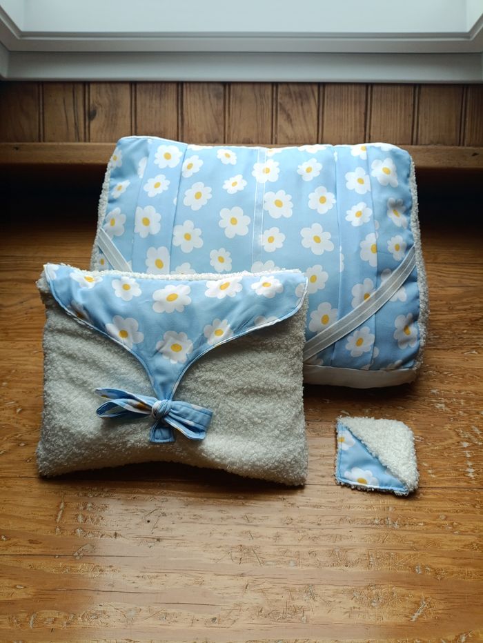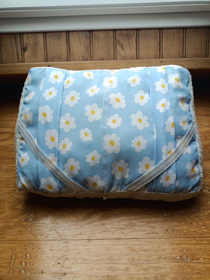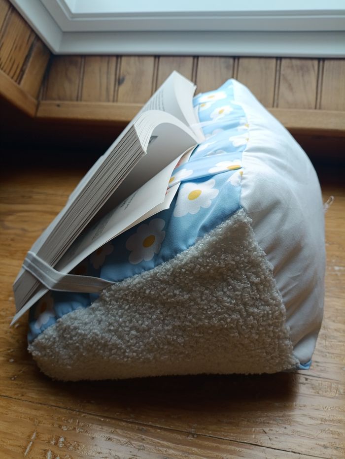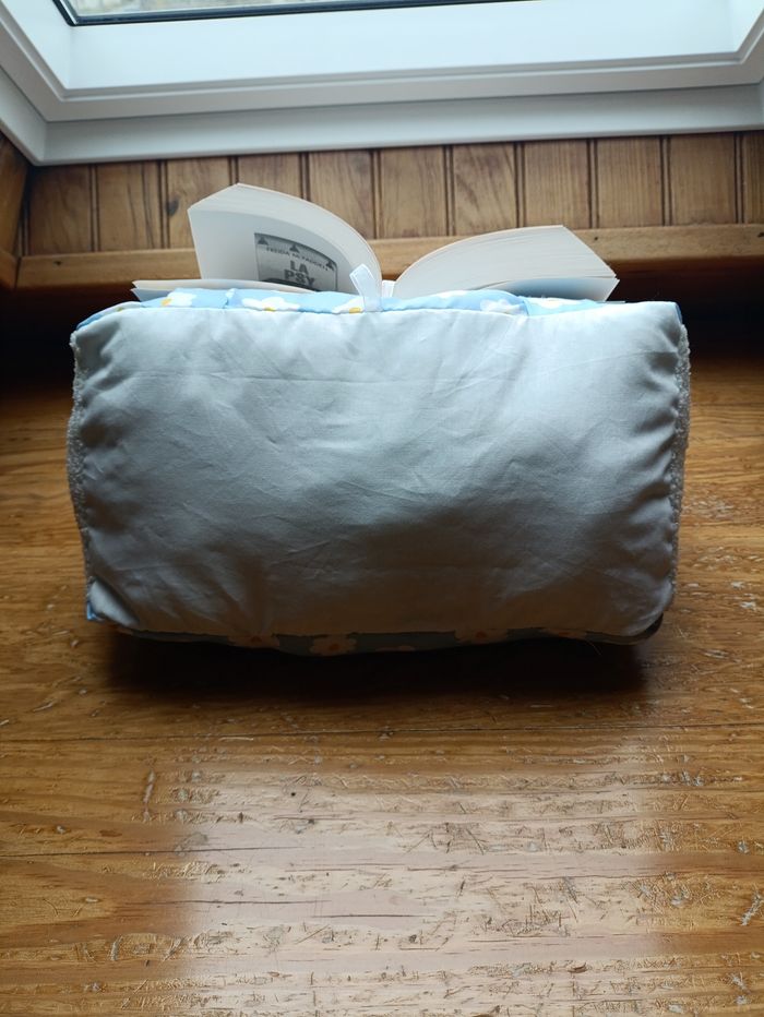 Lot de lecture comprenant un coussin de lecture, une pochette à livre et un marque-page assorti. Le tout dans les coloris blanc bouclette et tissu bleu à fleurs. Idéal pour les livres de poche et les livres brochés et reliés. Neuf