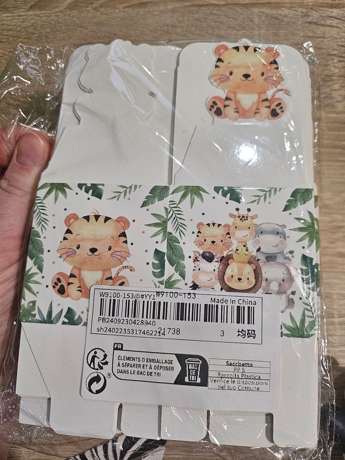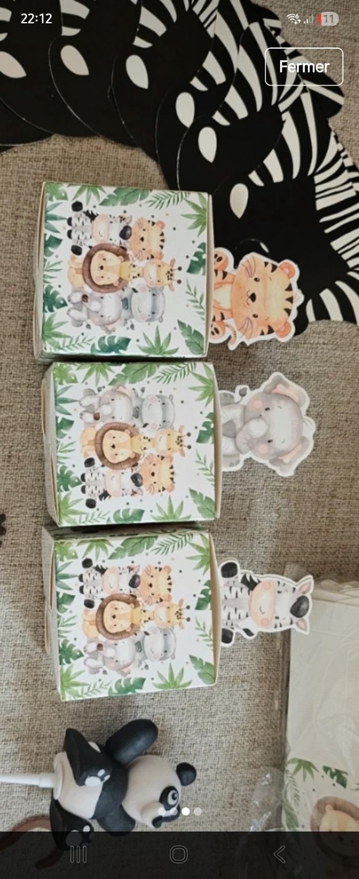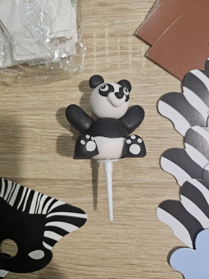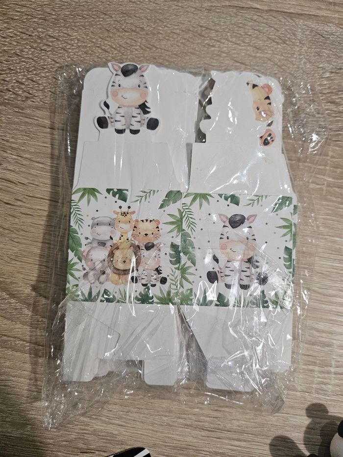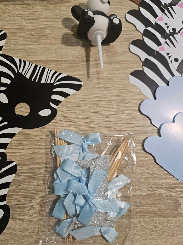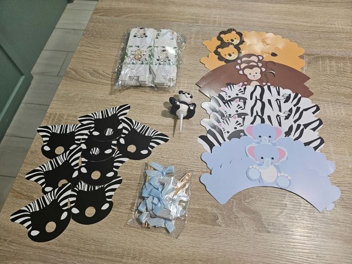 Lot de décoration de fête enfants thème jungle comprenant : - 21 petites boîtes animaux - 10 contours animaux pour muffins - 1 figurine panda pour gâteau - 10 pics "1" argenté avec noeuds bleu - 8 bas de têtes de zèbre que je me suis servis pour y placer des sucettes (possibilité de montrer des photos pour visualiser) Tout est neuf (surplus).