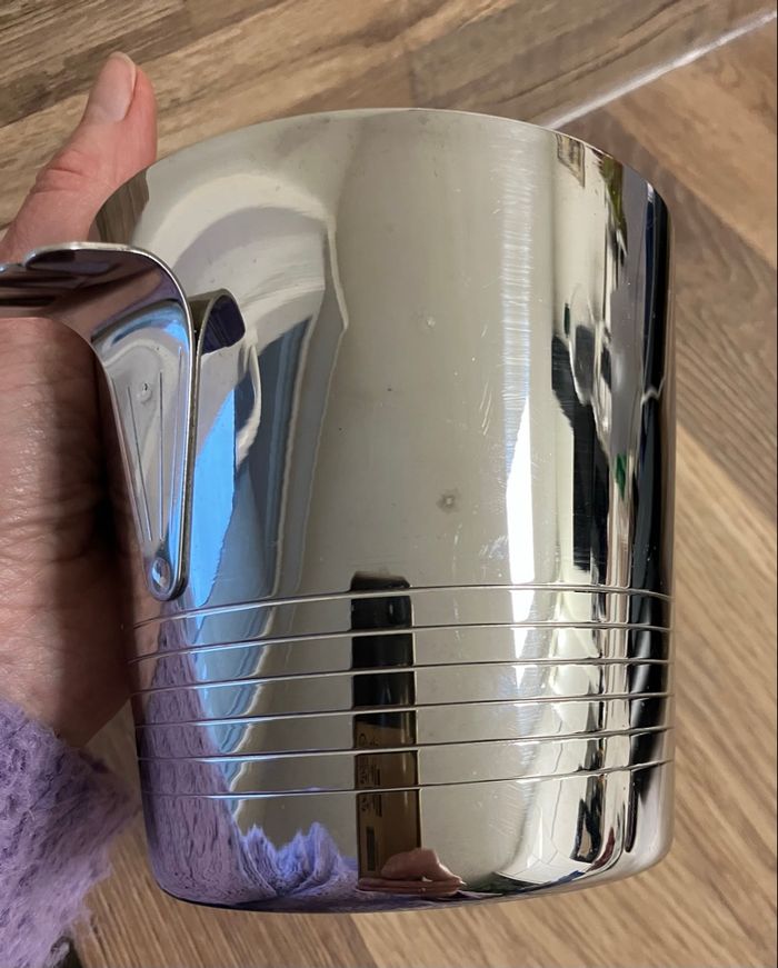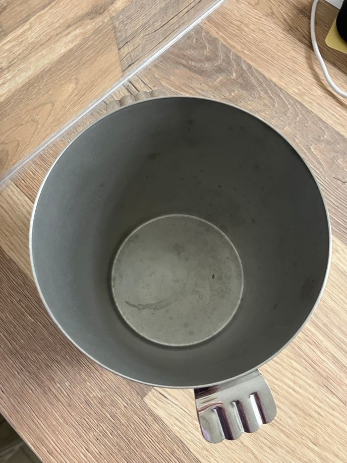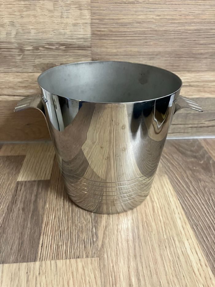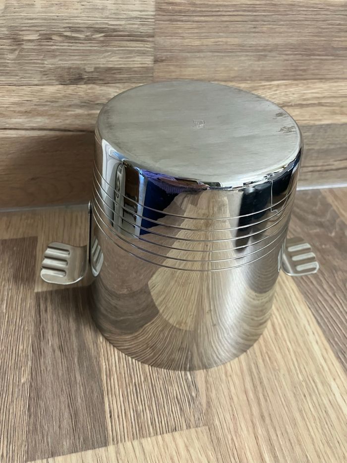 Élégant seau à glaçons en inox en bon état. ⚠️ il porte toutefois des traces d’utilisation (voir photos) Joli design avec 2 poignées. Peut être utilisé dans sa fonction initiale ou comme élément décoratif dans une cuisine ou un bar. Dimensions : - hauteur : 12 cm - diamètre base : 9 cm - diamètre haut : 12 cm