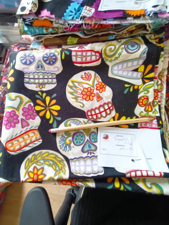 Coupon coton Alexander Henry Fabrics (import US). Motif crânes mexicains très colorés sur fond noir. Dimensions : environ 110 x 110 cm Qualité patchwork / couture accessoires / sacs / vêtements. Destockage atelier créatrice. Maison non fumeur – présence de chats (signalé par transparence).