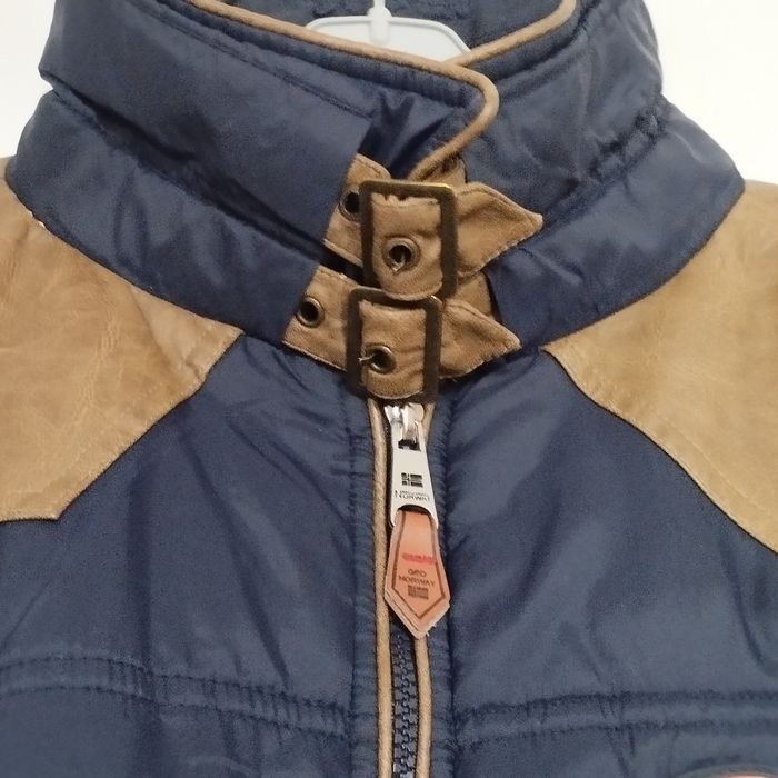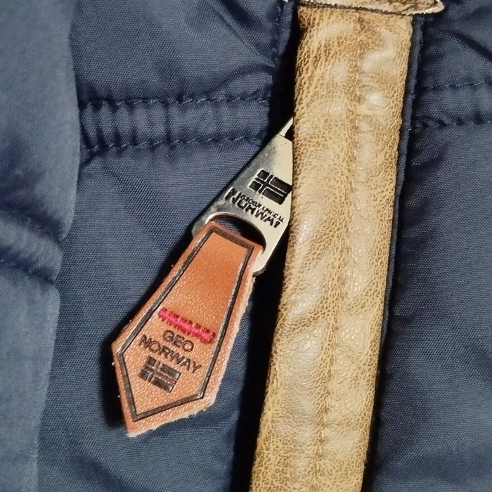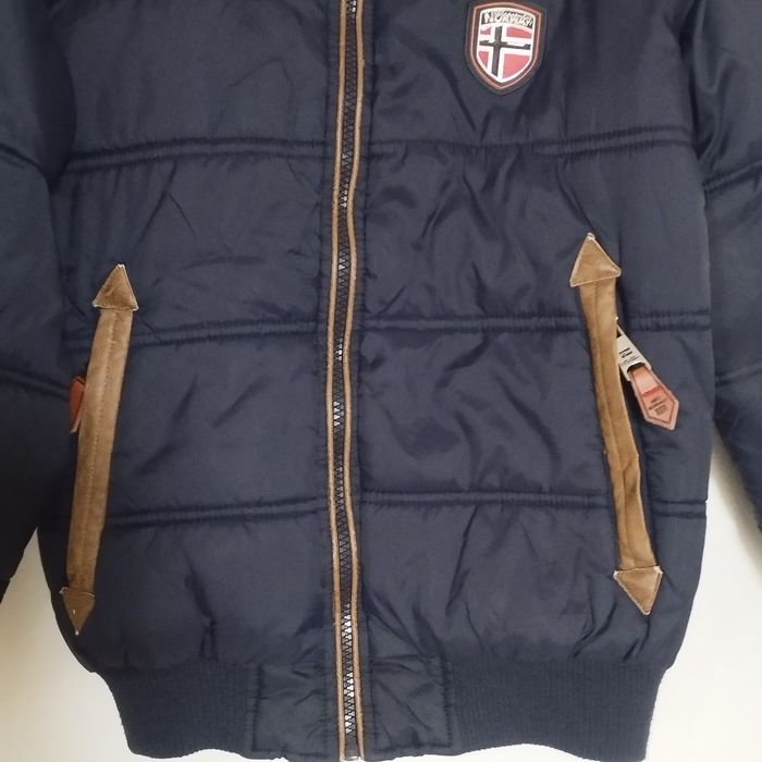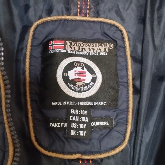 Parka pour enfant de 10ans de chez Geographical Norway. Col montant fermant jusqu'au haut du cou, 2 pates avec boucle métal. Grande fermeture éclair. 2 poches avant fermant fermeture métal. Et 2 autres intérieur fermant par bande scratch. Belle doublure intérieur. Plusieurs empiècements imitation cuir souple ! Logo métallique sur le devant , puis un grand sur le côté d'un bras en caoutchouc et métal. et un 3ème barre en métal.