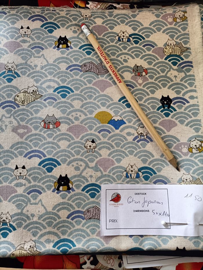Coupon coton japonais motif chats sur vagues (inspiration seigaiha). Idéal accessoires, trousses, sacs, patchwork. Dimensions : 50 x 110 cm. Qualité coton moyen. Destockage atelier créatrice. Maison non fumeur – présence de chats.