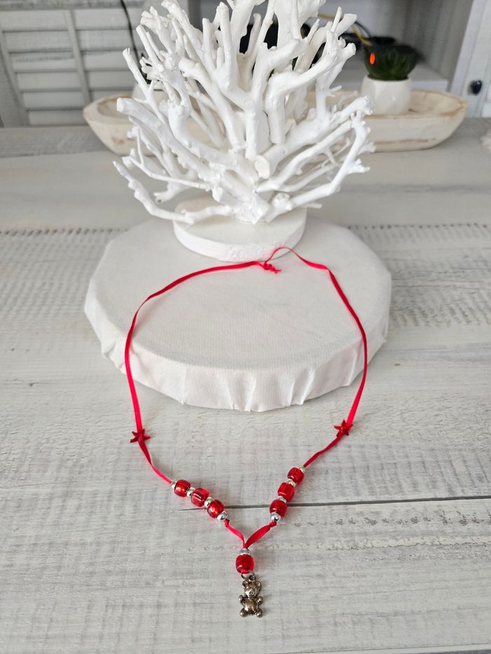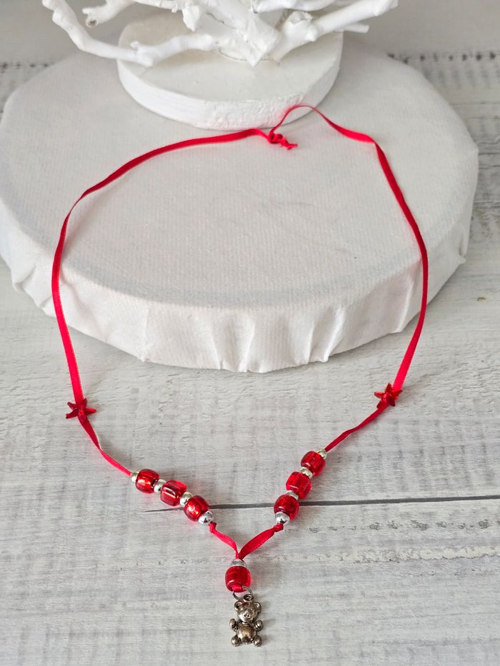Collier ruban rouge avec étoiles de chaque côté Perles rouges et argenté Pendentif ourson Acheté dans un magasin de bijoux fantaisie 12,99 euros État impeccable porté 1 fois