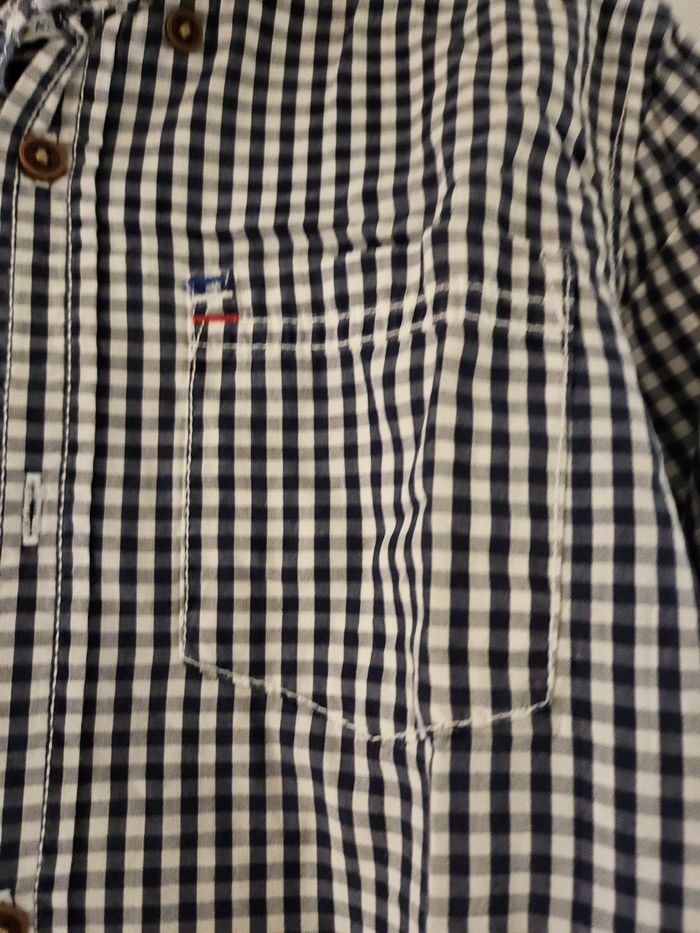 Chemise manches longues à carreaux blanc et bleu foncé. Se ferme par boutons. Marque : Gémo Taille : 8 ans