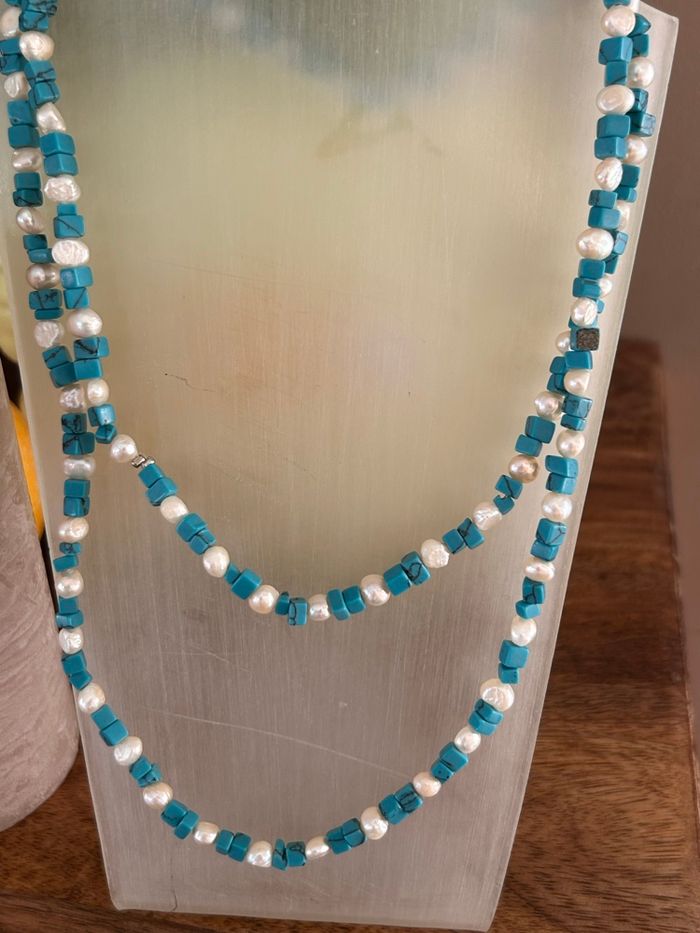 Collier en turquoise et perle pas de fermoir 49 cm j arrive à faire deux tours comme sur photo