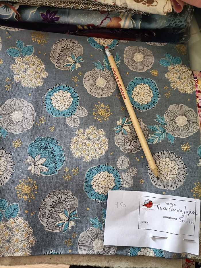 📏 50 x 110 cm Toile de coton épaisse type canvas. Fond gris bleuté, fleurs stylisées crème, turquoise et touches dorées. Idéal pour sacs, pochettes, coussins ou accessoires déco modernes. Très bon état. Maison non-fumeur avec chats.