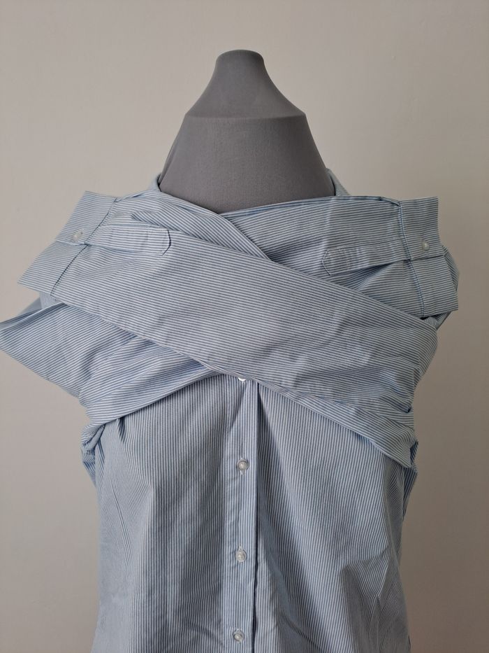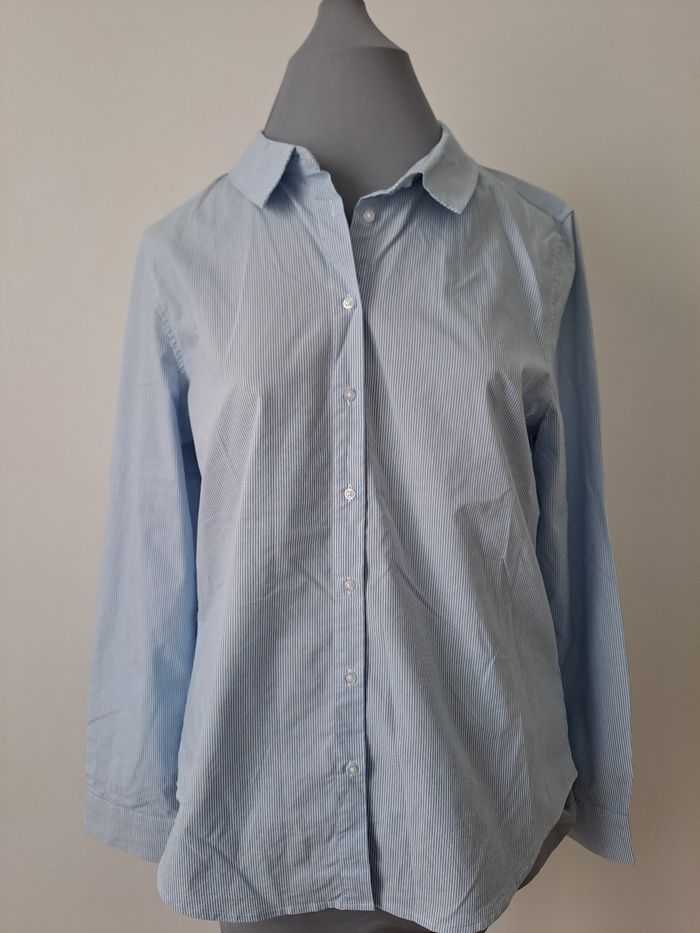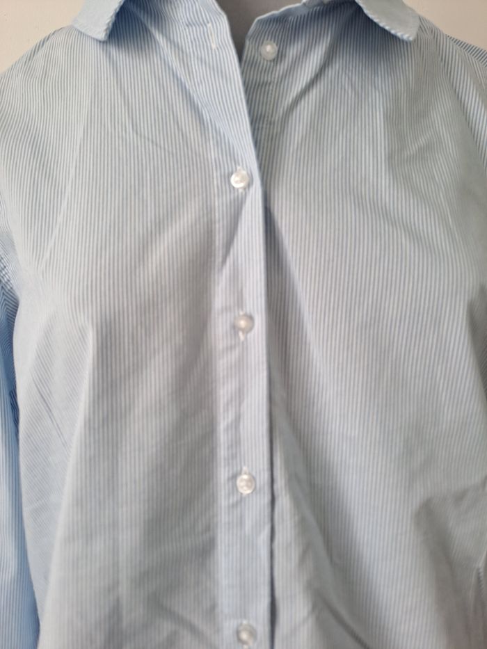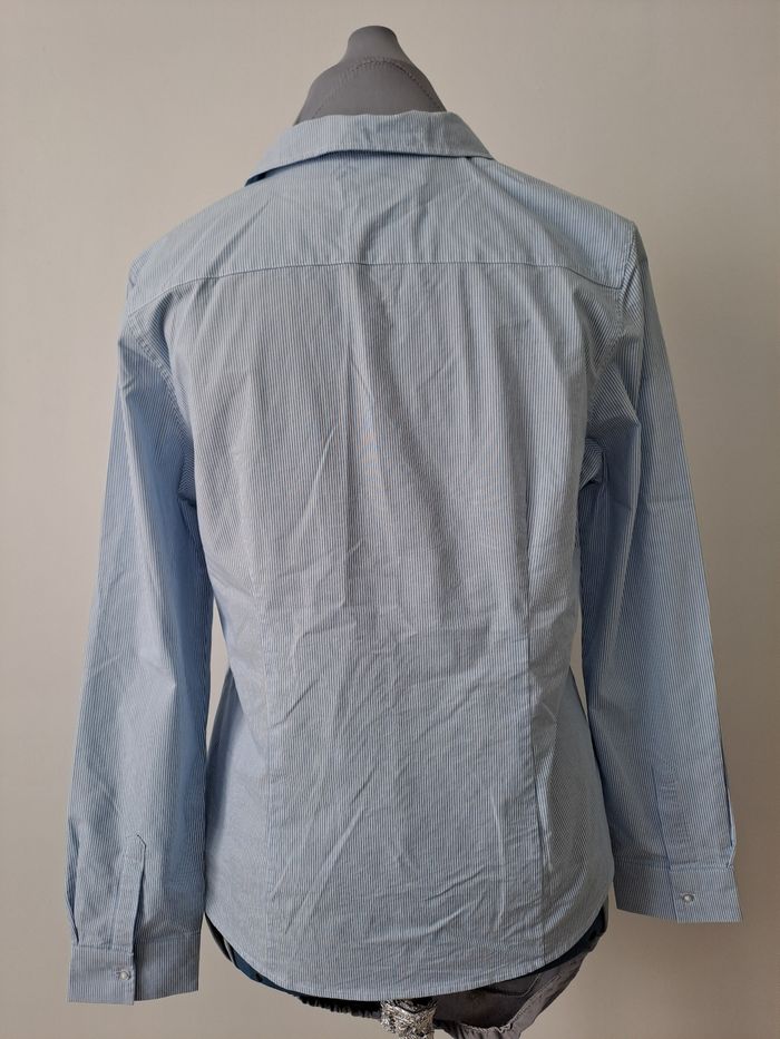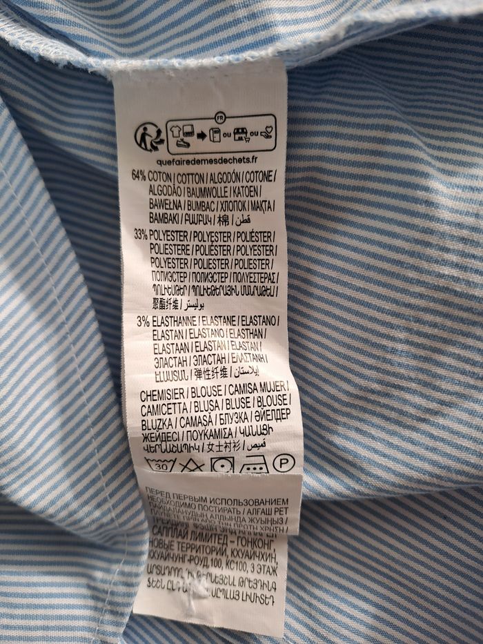 Chemise à rayures bleu et blanc, Coton, Polyester, Elasthanne Taille 42 étiquette mais correspond à un 40. Elle n'est pas repassé.