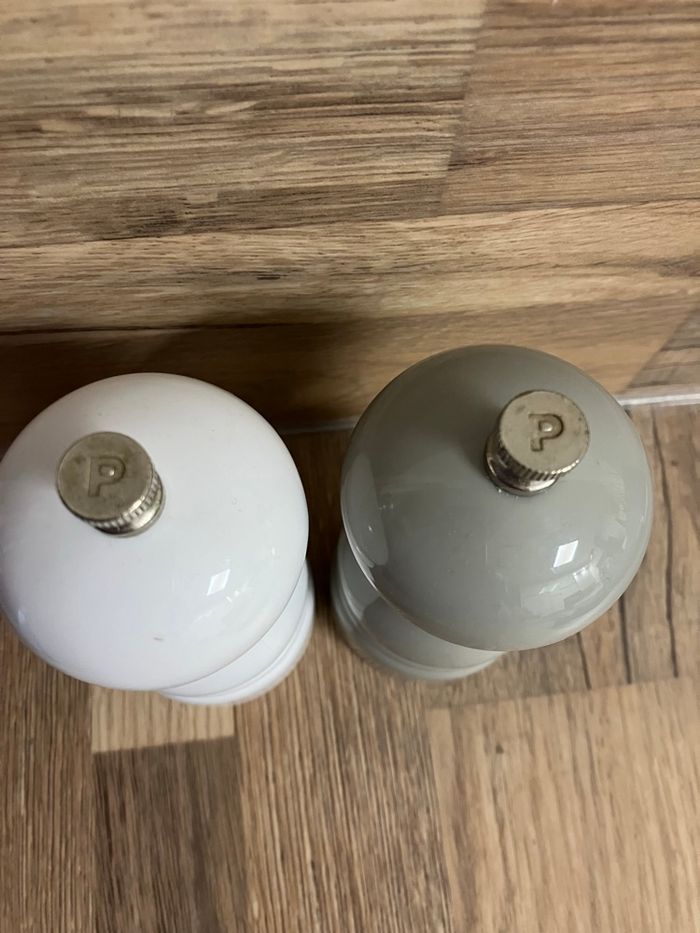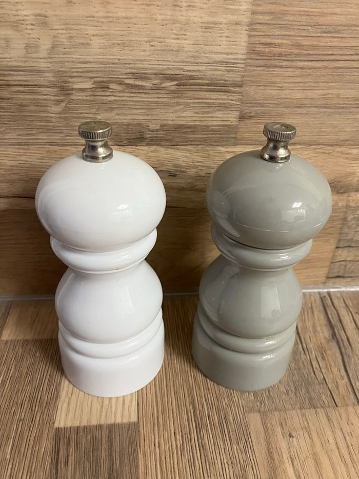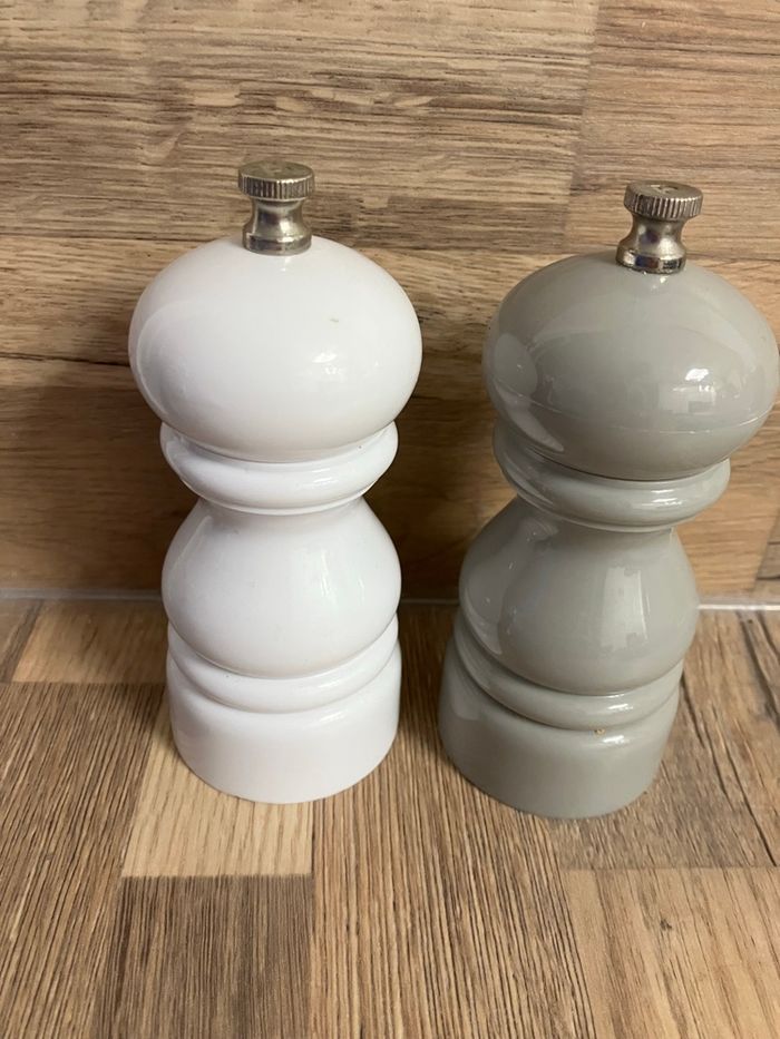 Ce lot comporte 2 moulins à poivre en bon état : ils ont servi mais sont fonctionnels. l’un est blanc, l’autre gris Dimensions : - hauteur : 12,5 cm - diamètre de la base : 5 cm