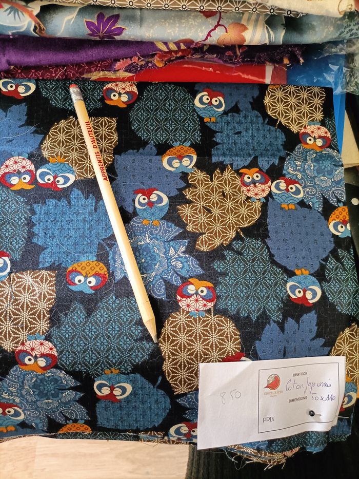 Je propose ce coupon de coton japonais au motif hiboux stylisés sur fond bleu profond avec feuillages et motifs traditionnels. Imprimé original et décoratif, belles couleurs contrastées. Tissu agréable à travailler, idéal pour projets couture créative. 📏 Dimensions : 50 x 110 cm 🧵 Type : coton japonais 🎨 Motif : hiboux, feuillage, style traditionnel ✨ État : neuf – non utilisé Idéal pour : – trousses – pochettes – sacs – patchwork – accessoires – petits objets déco textile Maison non-fumeur. Présence de chats – stockage en bac fermé. Envoi soigné.