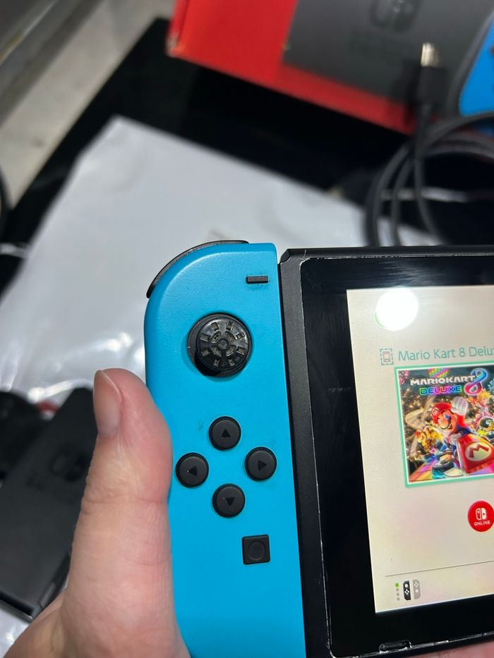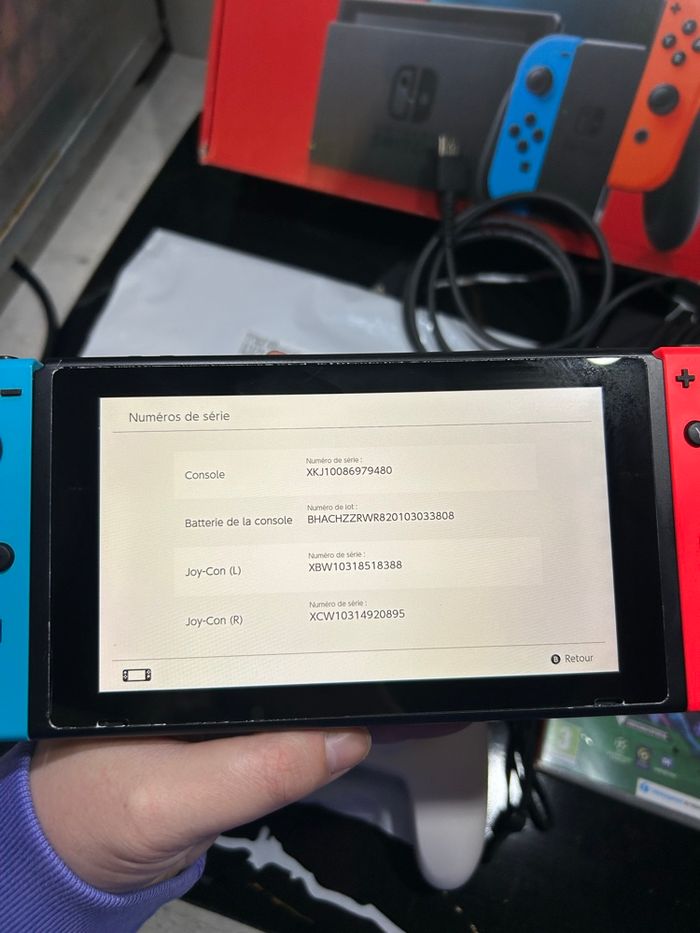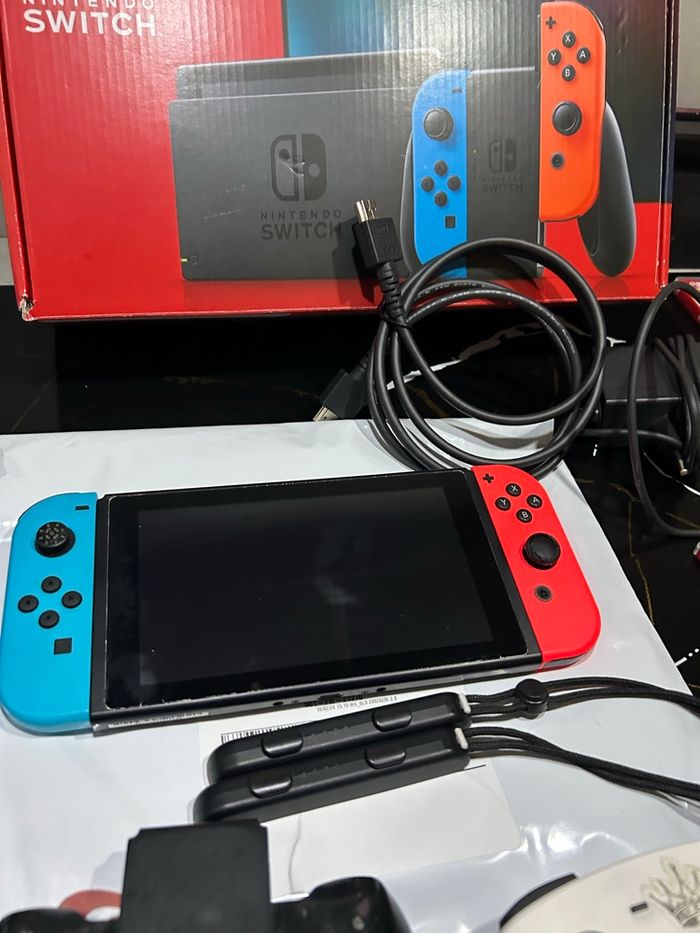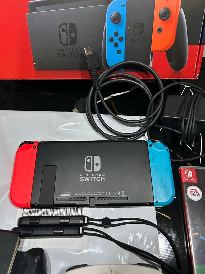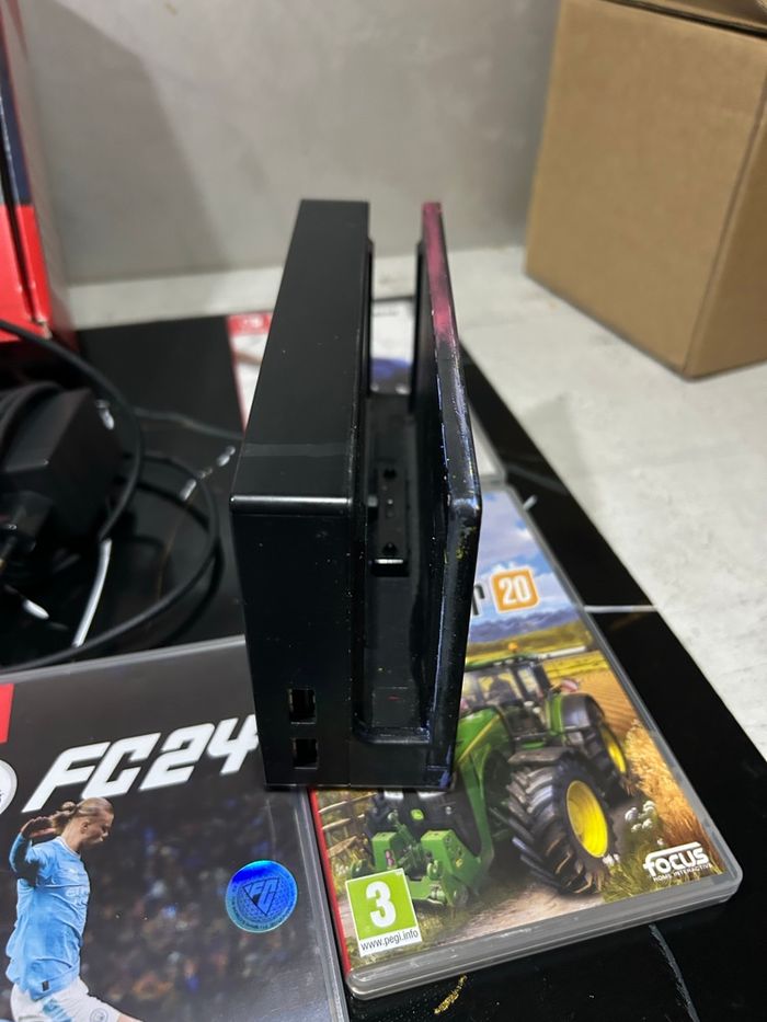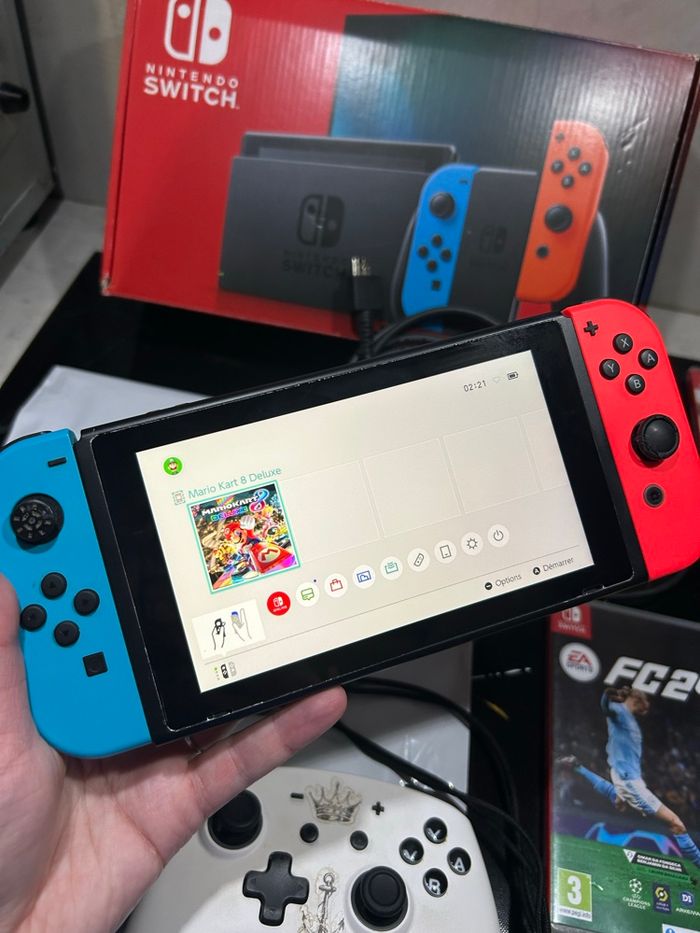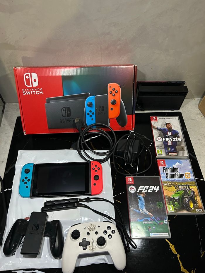 À vendre, Console Nintendo switch bleue et rouge, vendue complète avec tous ses accessoires. La console est en bon etat, écrans propres,attention la petite languette derrière Est parfois fragile. Le dock est fourni mais est en mauvais état esthétique pour cause, l’ancien propriétaire l’avait peint 😅. 3 jeux fournis avec,deux jeux fifa football 2023 et 2024 et farming simulator Je donne une 2e manette mais c’est un cadeau donc aucun retour possible, des fois elle beugue. Bonne autonomie, câble hdmi et chargeur d’origine et boîte. Année 2019. À venir chercher sur place merci Prix non négociable