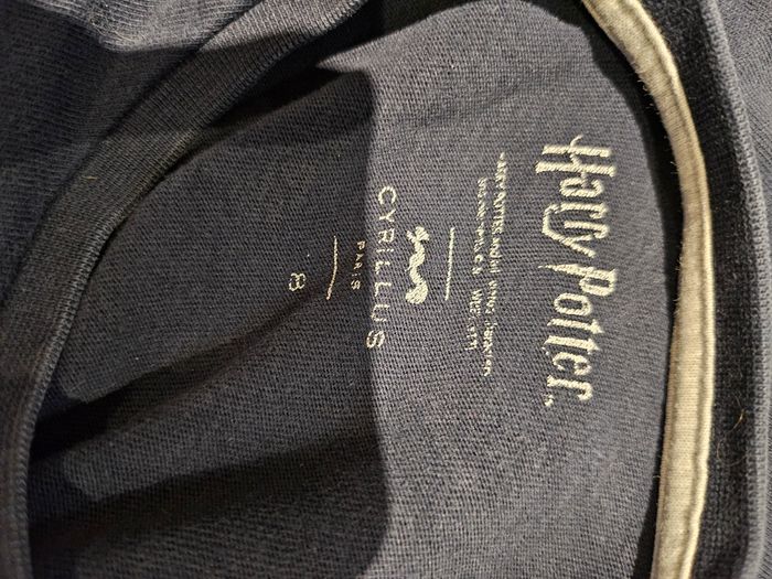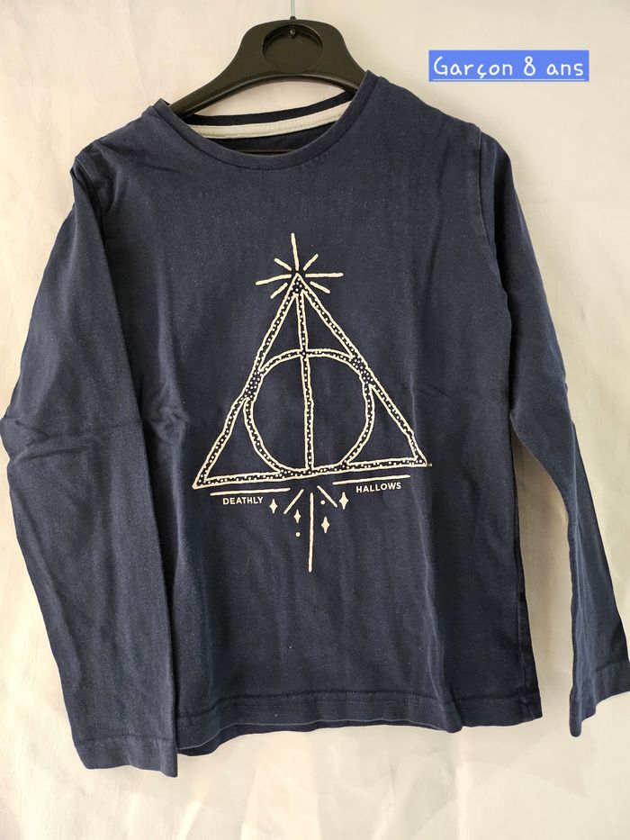 T-shirt manches longues bleu avec imprimé blanc à l'effigie d'harry Potter. Marque : Cyrillus Taille : 8 ans