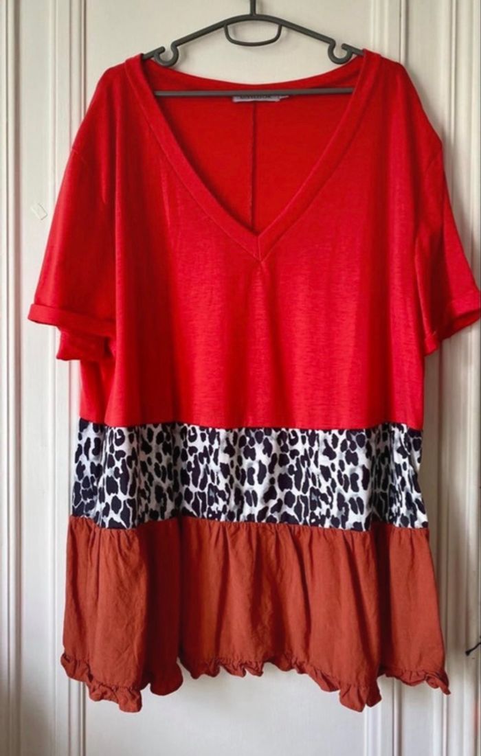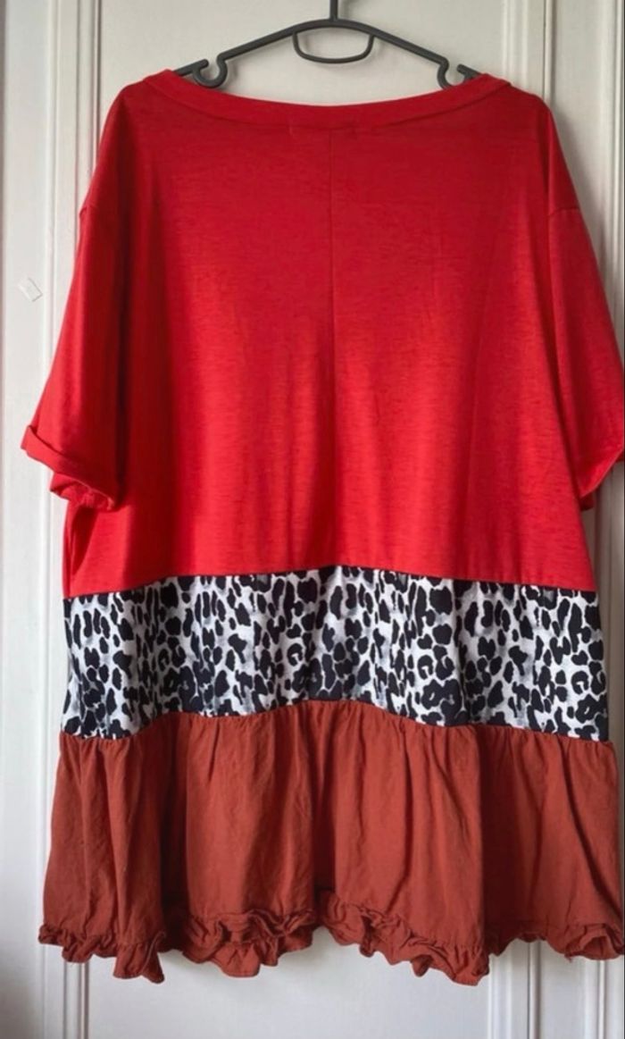 Tee-shirt manche courte long ,en coton rouge et marron, imprimé léopard, neuf .