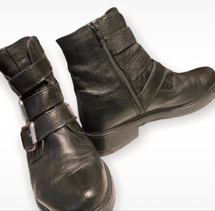 Bottines motardes en cuir . Fermeture éclair sur le côté .Bon état , bien entretenues. Hauteur de la tige 14 cm Hauteur du talon 3 cm