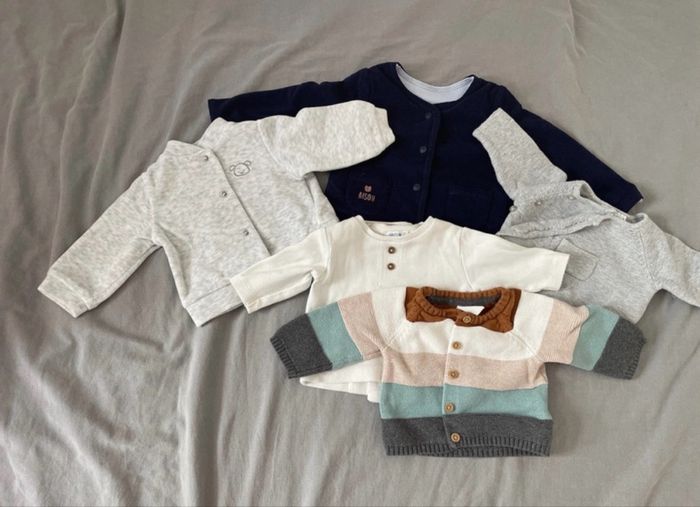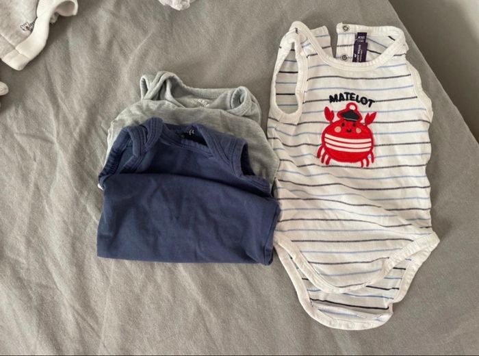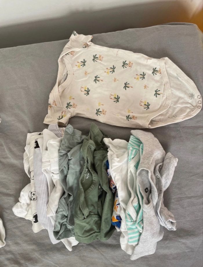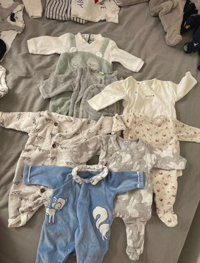 Tout ce qu’il vous faut pour un garçon entre 50-56 cm (1-3 et mois) environs, qui naît en automne/hiver ! Tous les articles ont été portés mais toujours traités avec soin et amour (lessive spéciale bébé, sèche-linge délicat). Il peut y avoir des tâches mais dans l’ensemble les articles sont très bien ! Marques : H&M, Bout’chou, Zara, Z, Zeeman, tape à l’œil, kiabi, Primark, Sergent Major, chicco, prénatal, … Dans le détail (les photos vont dans l’ordre) : - environs 20 bodies manches longues - 12 bodies manches courtes - 3 bodies débardeurs - 3 pyjamas légers avec pieds - 7 pyjamas épais (avec ou sans pieds) - 7 ensembles haut + bas + fois bonnet associé (le haut ça peut être un t-shirt, un body ou une veste) - 5 vestes manches longues avec petits boutons (4 devant ou 1 derrière) - 10 pantalons (6 fins et 4 plus épais) - 1 combinaison doublée - 1 combinaison pilote d’extérieur avec capuche - 2 bonnets, 1 bavoir et des chaussettes N’hésitez pas à me contacter pour plus de renseignements ou de photos ! Achat d’une seule partie du lot et négos (dans la limite du raisonnable) possible.