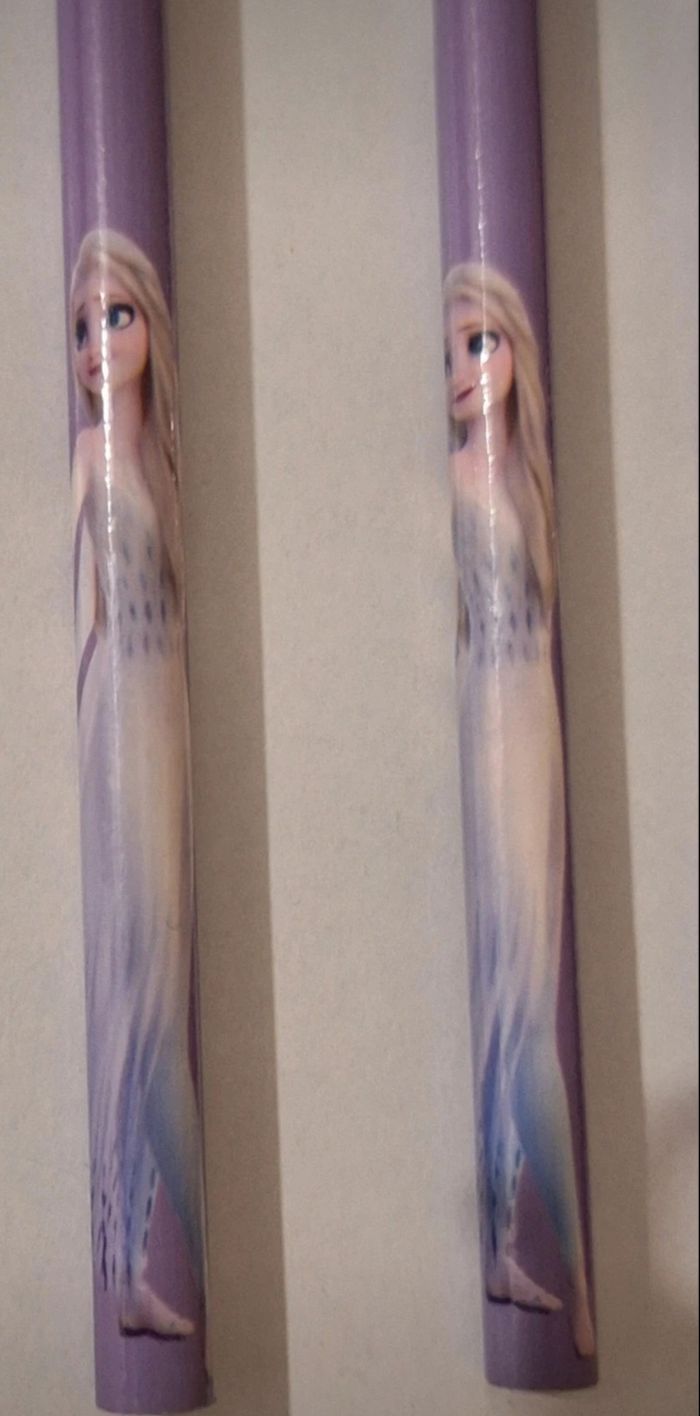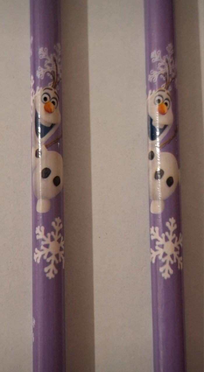 Lot de quatre crayons de bois Reine des Neiges et Olaf de longueur 17,5 cm.