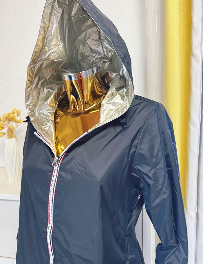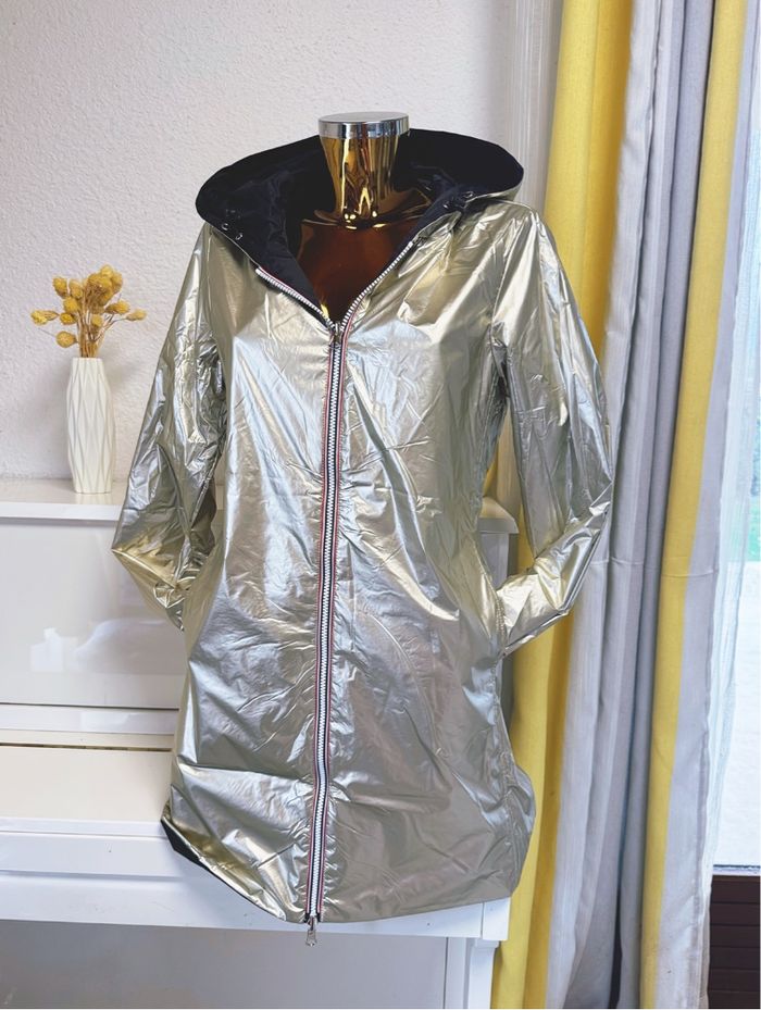 Veste long (mi cuisses) réversible et imperméable avec ouate noir doré taille S 100% polyamide… Les dimensions aisselles à aisselles:50cm Longue:80cm