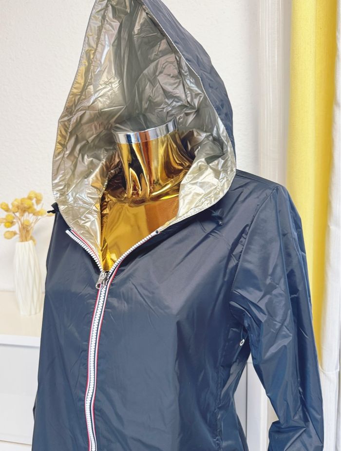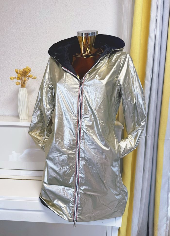 Veste long (mi cuisses) réversible et imperméable avec ouate noir doré taille M 100% polyamide… Les dimensions aisselles à aisselles:52cm Longue:80cm