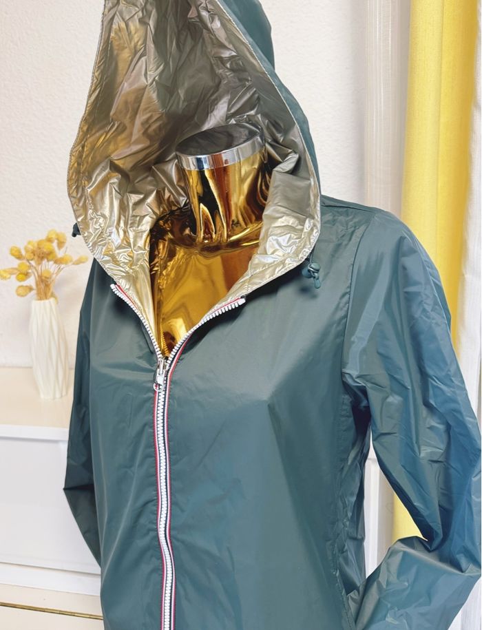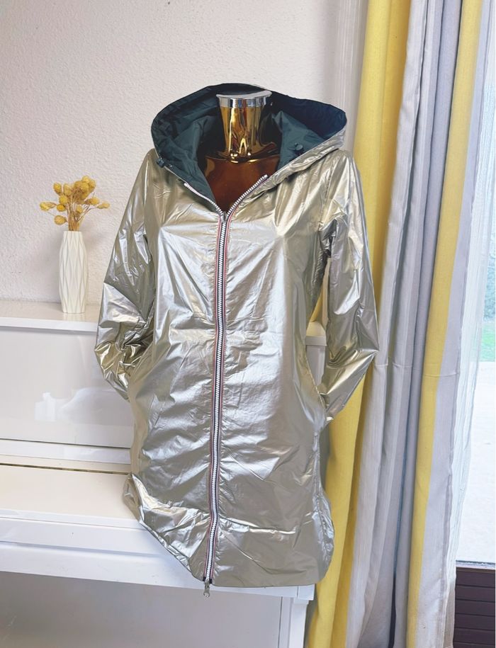 Veste long (mi cuisses) réversible et imperméable avec ouate verte forêt doré taille L 100% polyamide… Les dimensions aisselles à aisselles:52cm Longue:80cm