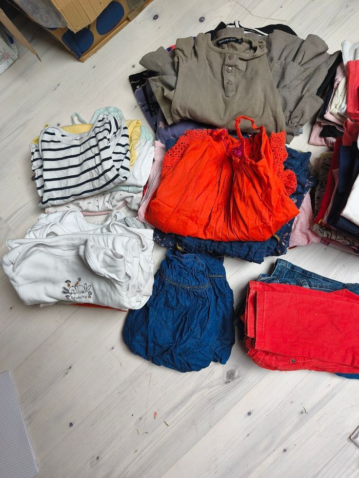 *Je vends ce lot de 79 vêtements fille en 3 ans toute saison. Ce lot contient 12 t-shirt manches longues, 2 pyjamas fin en état satisfaisant , 6 débardeurs, 4 pulls , 1 poncho, 3 gilets , 17 t-shirts manches courtes, 3 pantalons, 1 jupe , 6 robes étés, 6 robes toutes saisons , 11 bodies manches longues , 7 bodies manches courtes et bretelles . * 4-5 vêtements sont tachés mais très peu * Pas de trou * Certains vêtements sont comme neuf .