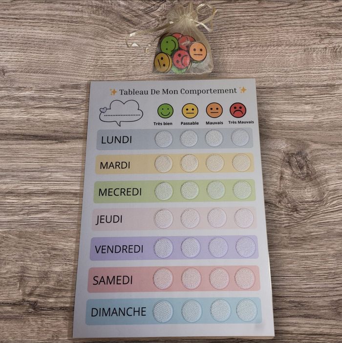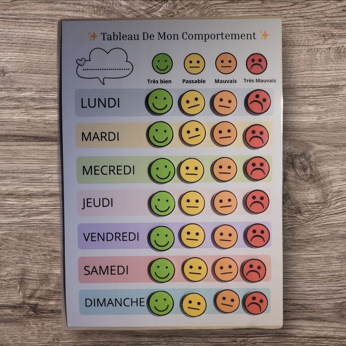 ✨ Tableau de Mon Comportement ✨ Un outil ludique et éducatif pour accompagner les enfants au quotidien, à la maison ou en collectivité 🏡🏫 🧲 Réutilisable avec scratch (Velcro) ● Les bonhommes s’attachent et se détachent facilement pour une utilisation à l’infini ♻️ 📅 Organisation hebdomadaire ● Le tableau comprend les 7 jours de la semaine. 😊 Choix du comportement Chaque jour, le parent accompagne l’enfant pour choisir le bonhomme correspondant : 🟢 Très bien • 🟡 Passable • 🟠 Mauvais • 🔴 Très mauvais 👉 7 bonhommes de chaque couleur inclus. ✍️ Espace personnalisé Une bulle permet d’écrire le prénom, un objectif ou un message d’encouragement. 🧠 Objectifs pédagogiques ✔️ Favoriser le dialogue ✔️ Aider à comprendre et exprimer son comportement ✔️ Encourager la bienveillance