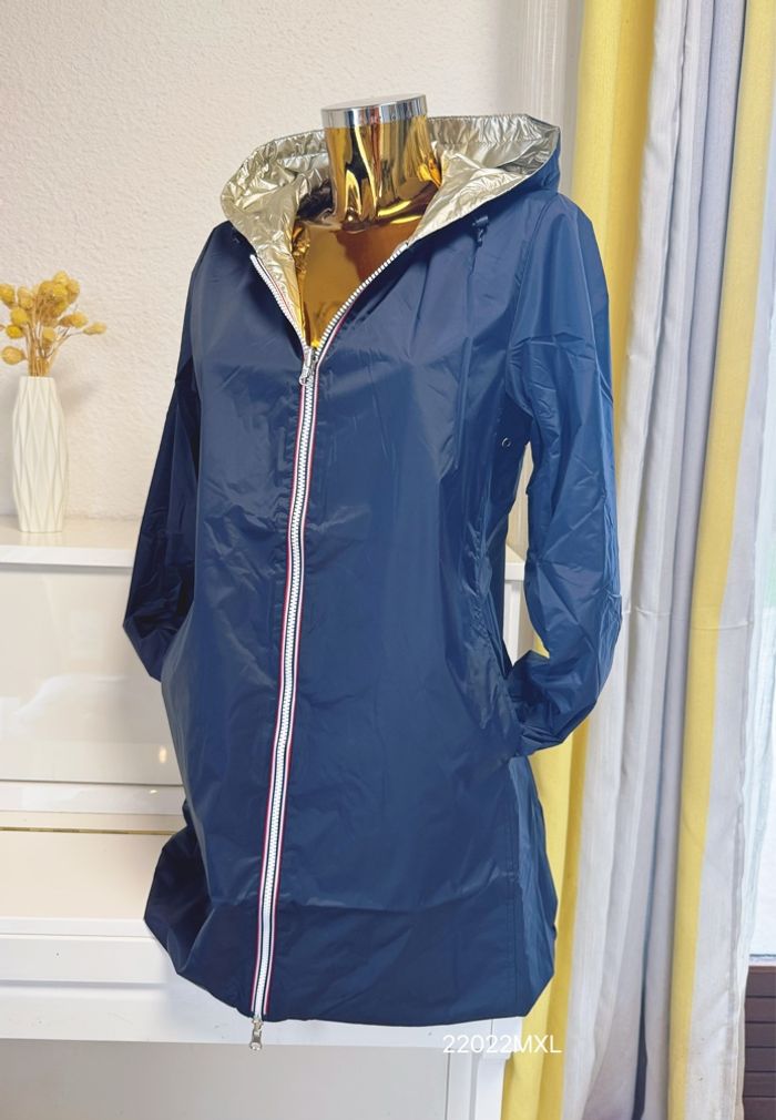 Veste long (mi cuisses) réversible et imperméable avec ouate marine doré taille XL 100% polyamide… Les dimensions aisselles à aisselles:56cm Longue:82cm