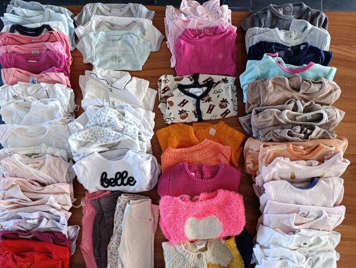23 bodies manches longues 3 manches courtes 14 pyjamas dont 1 leger ( Harry Potter) 8 pull/ gilets 4 pantalons Toutes marques beaucoup de bodies petit bateau, sinon orchestra Kiabi tape a l'oeil, Z, natalys, la redoute Disney ect... Très bon état