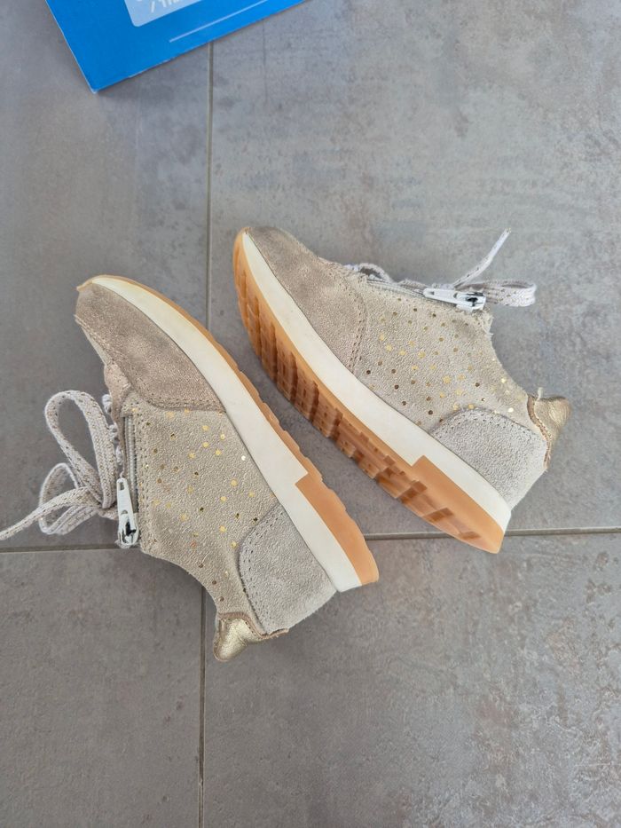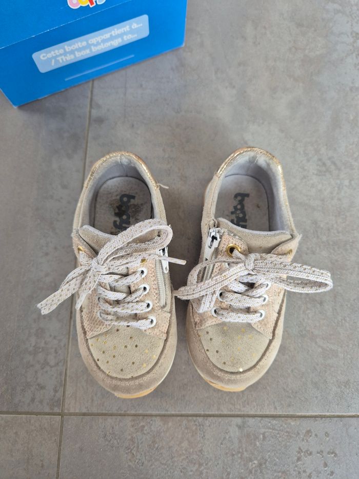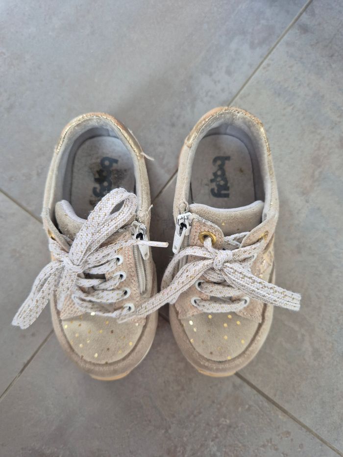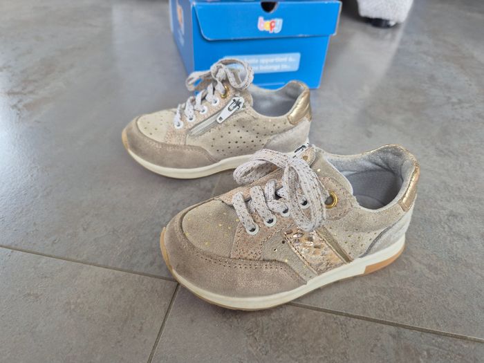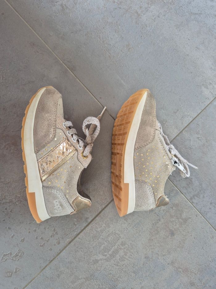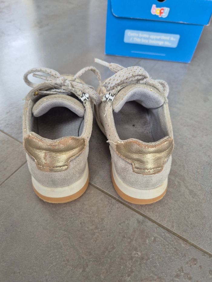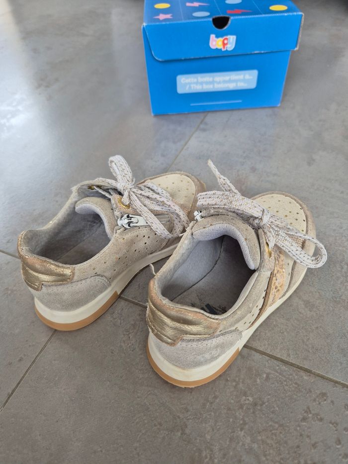 Pointure 24. Baskets à lacets et fermeture de la marque Bopy en bon etat général. Un peu de nubuck et imprimée de pois. Tout cuir. Semelles en tres bon état.