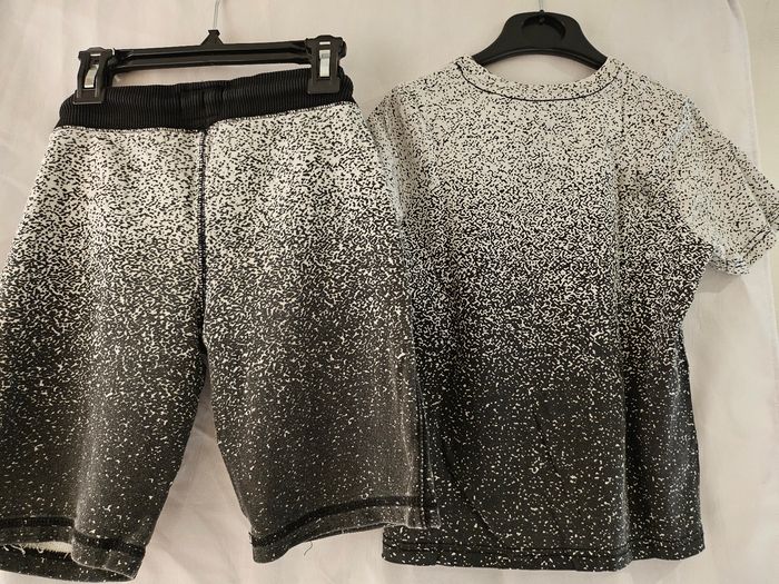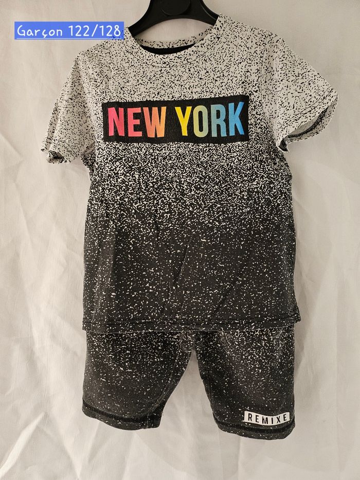 Ensemble deux pièces comprenant : - T-shirt manches courtes blanc et noir avec inscriptions New York multicolore. Marque : C&A Taille : 122-128 - Short blanc et noir. Taille élastique qui se serre par cordon. Marque : C&A Taille: 128