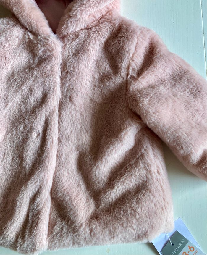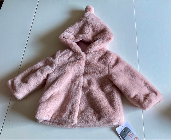 Joli manteau doublé avec capuche, très doux au toucher, neuf avec étiquette. Chaud et de qualité. Taille 3-6 mois. Envoi soigné