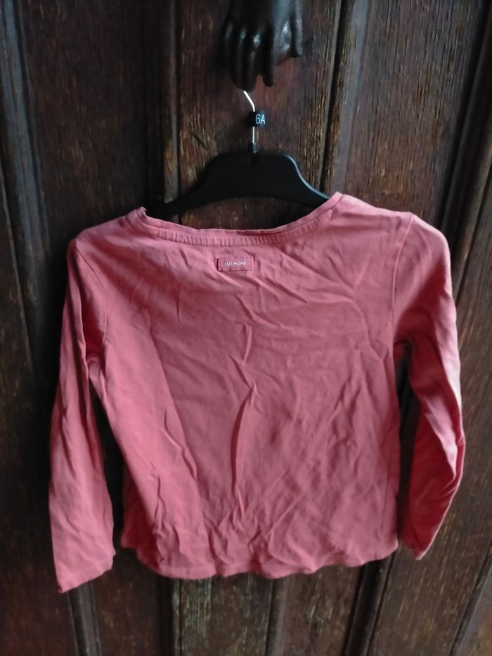 TBE très joli tee shirt à manches longues en jersey de coton rose/ corail. Inscription fantaisie devant et étiquette catimini au dos