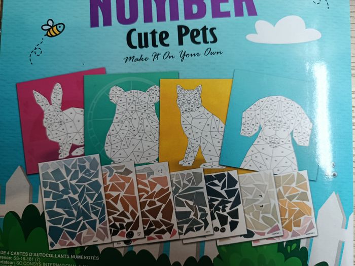 Mosaïque par numéro animaux. Set de 4 cartes d'autocollants. Ensemble d'autocollant à coller en suivant les numéros. Idéal pour occuper le temps des enfants et faire travailler leur concentration et leur patience. Neuf sous emballage Ne convient pas aux enfants de moins de 3 ans.