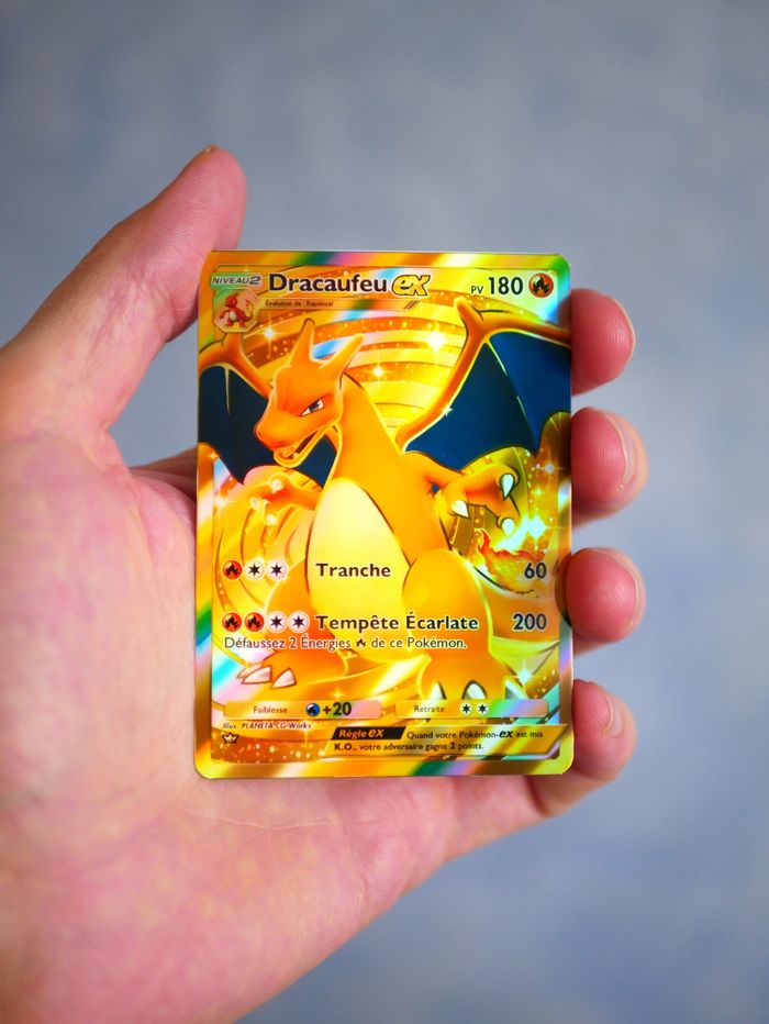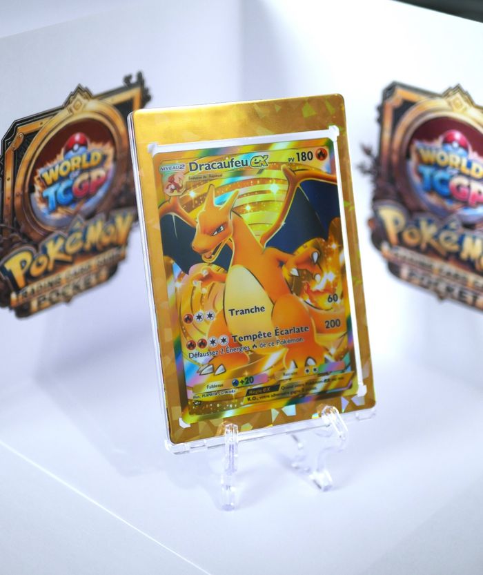 Carte Dracaufeu Ex Gold Tcgp réalisée a la main, avec boitier Or et support de présentation.