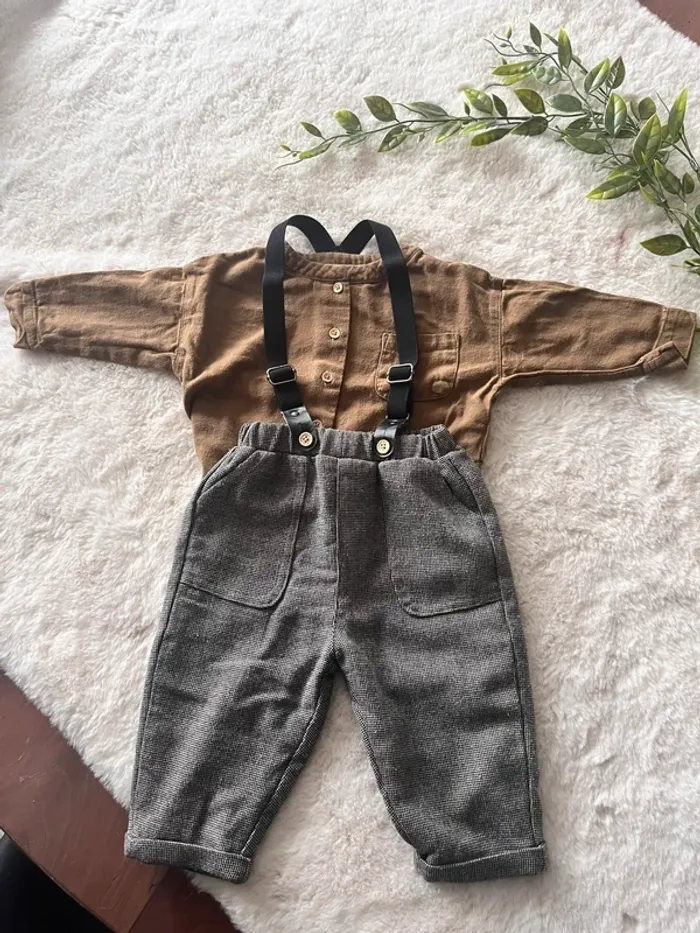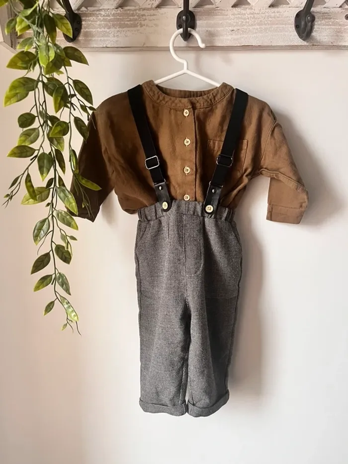 Ensemble comprenant teeshirt manche longue avec bouton sur le devant. Un pantalon à petit carreaux et une paire de bretelle réglable. Très bon état. Peu porté. N’hésitez pas à demander plus de photos ! 🧼 Vêtements lavés, repassés, maison non fumeur. 📦 Envoi rapide et soigné. 🎁 Réduction si lot avec d’autres articles ! #madelinelc9mois