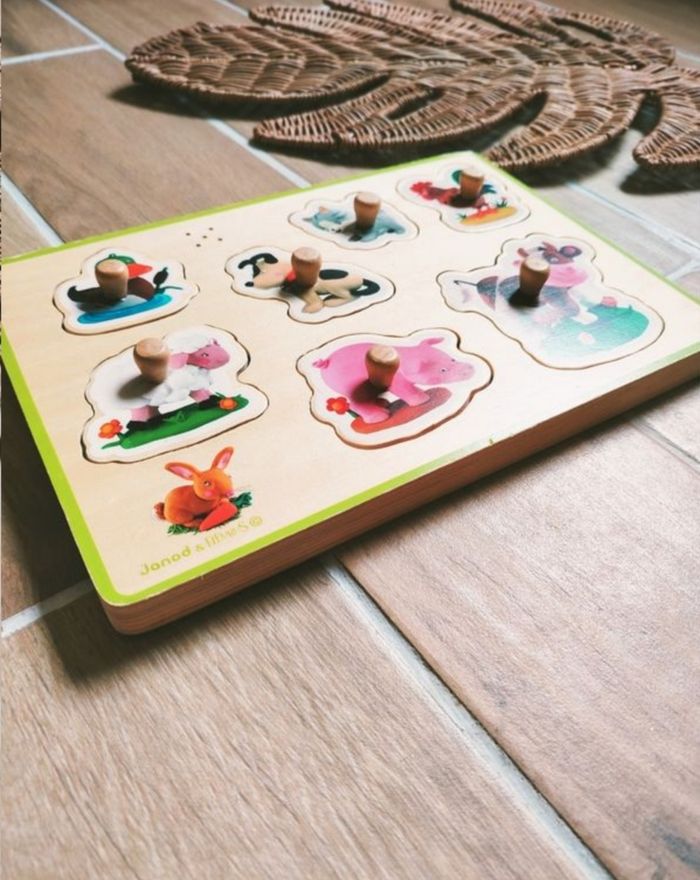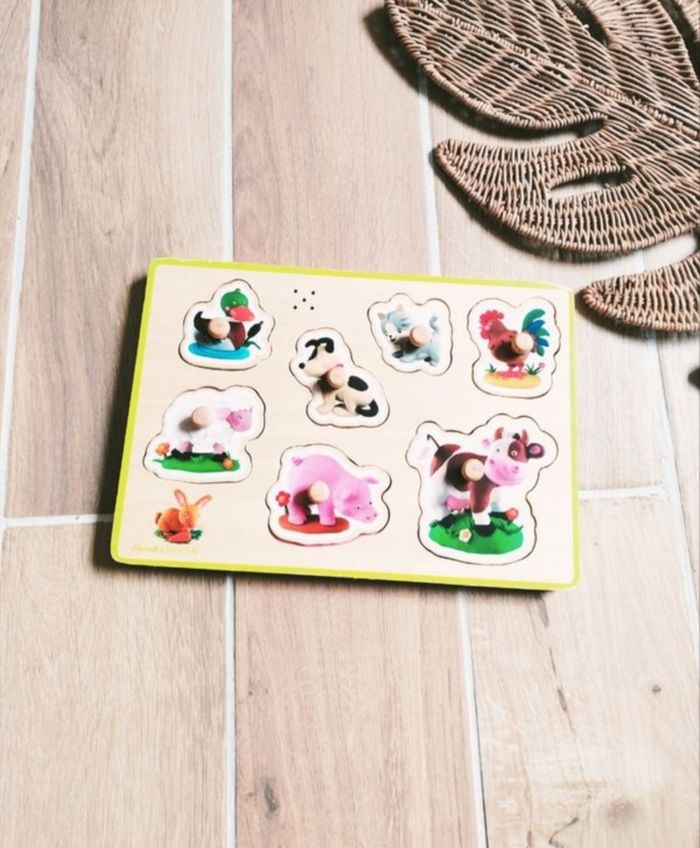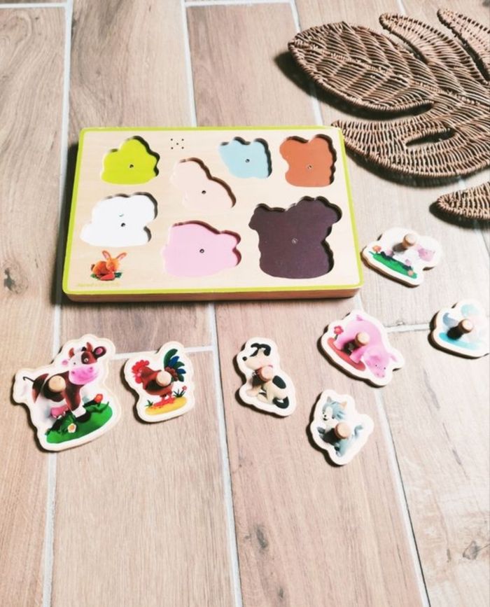 🐷Jeu de motricité-Puzzle d'encastrement en bois sonore animaux de la ferme - marque Janod - photo numéro 1