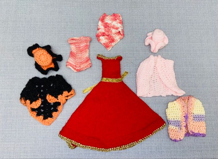 Lot vêtements poupée barbie crochet Acheter dans un marché artisanale 10 eur la tenue Très bien fait et magnifique - 1 gilet noir et son chapeau assorti - 1 robe rouge - 1 combishort et son châle - 1 gilet rose et son chapeau assorti - 1 gilet jaune orange