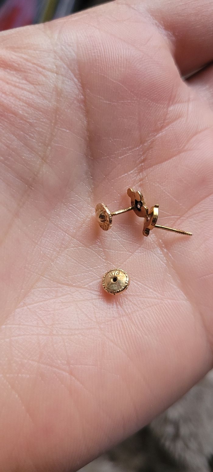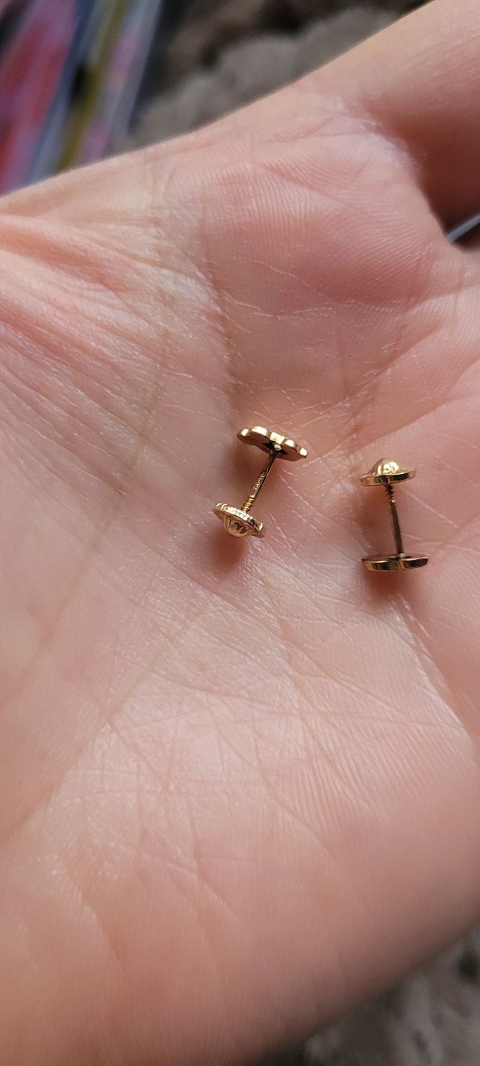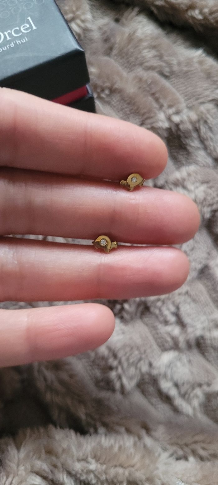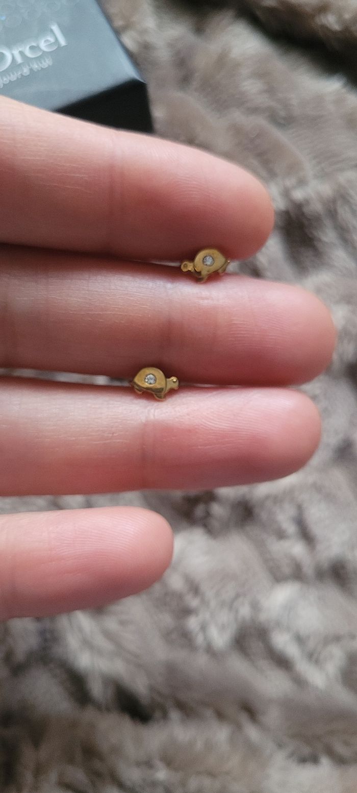 Boucles d'oreilles enfant en or jaune 9 carats tortues avec pierre au milieu fermoir a visser Tres bon etat Pour enfant ou bebe Prix ferme