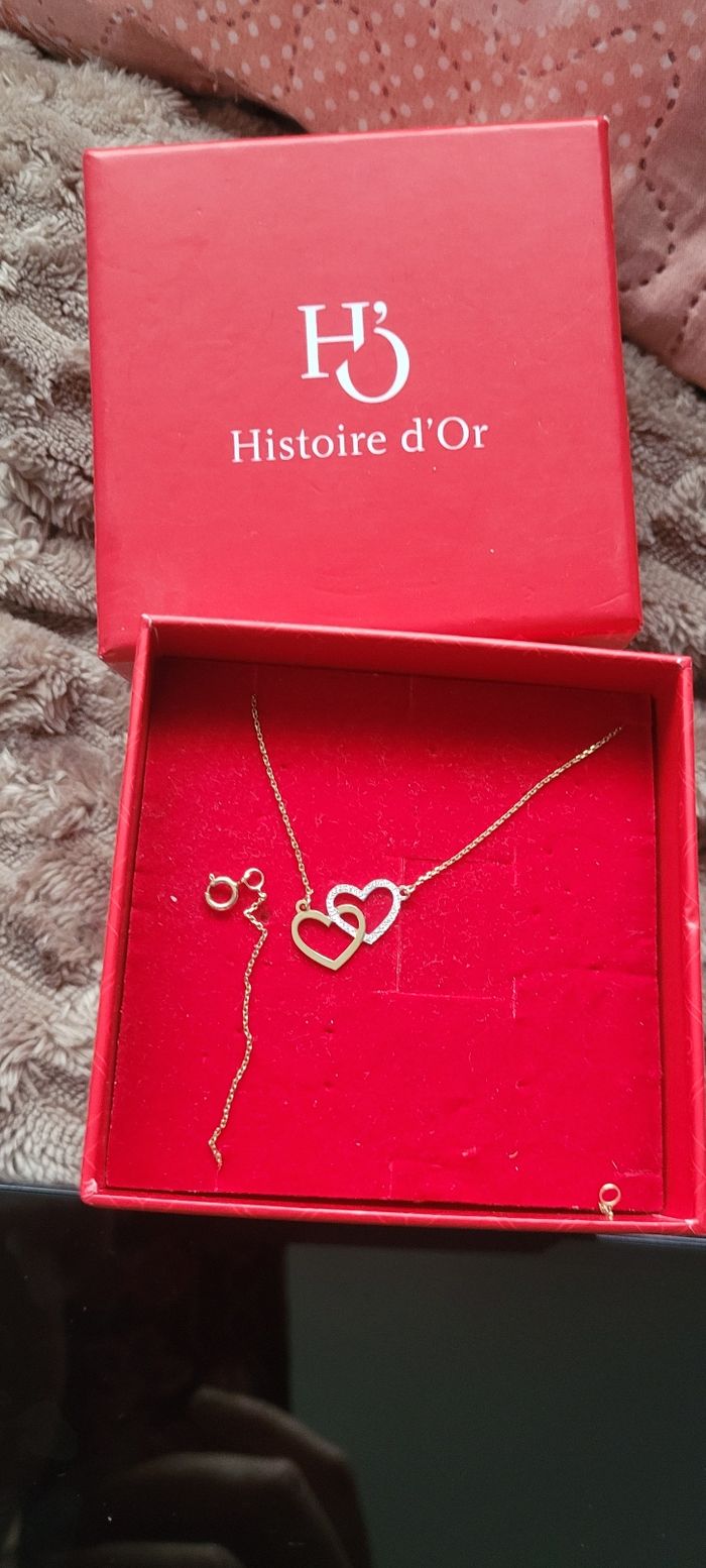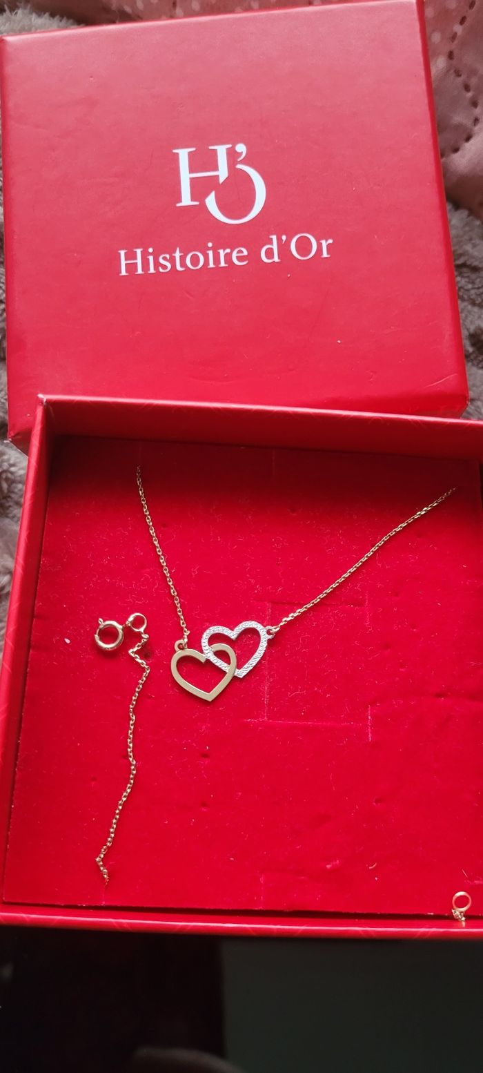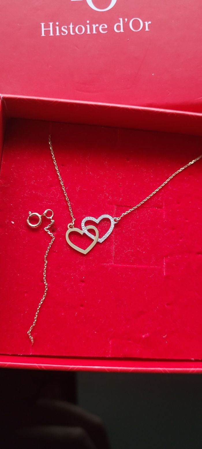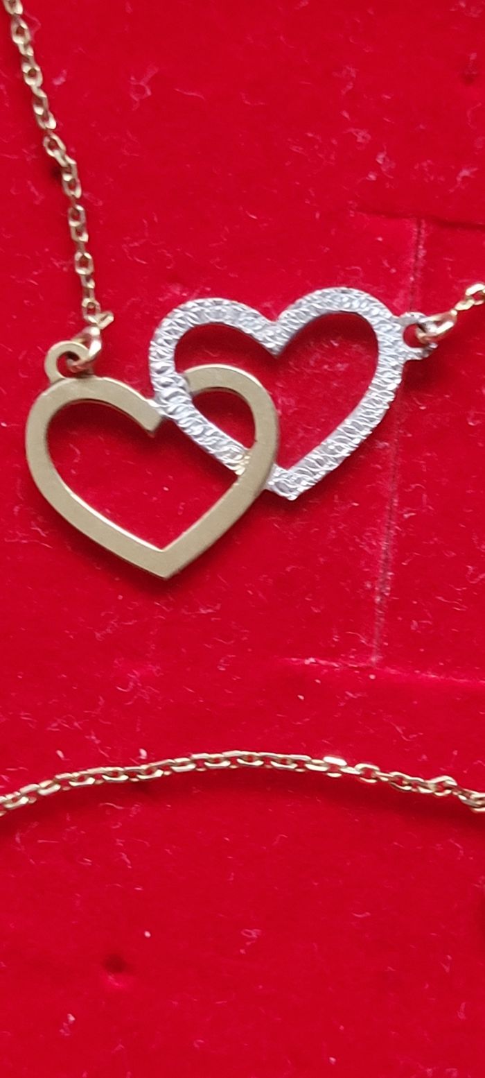 Collier en or jaune 9 carats avec coeur enlacé En tres bon etat comme neuf joli a porter vendu dans son ecrin