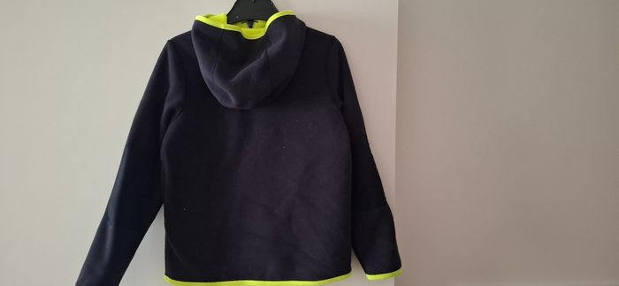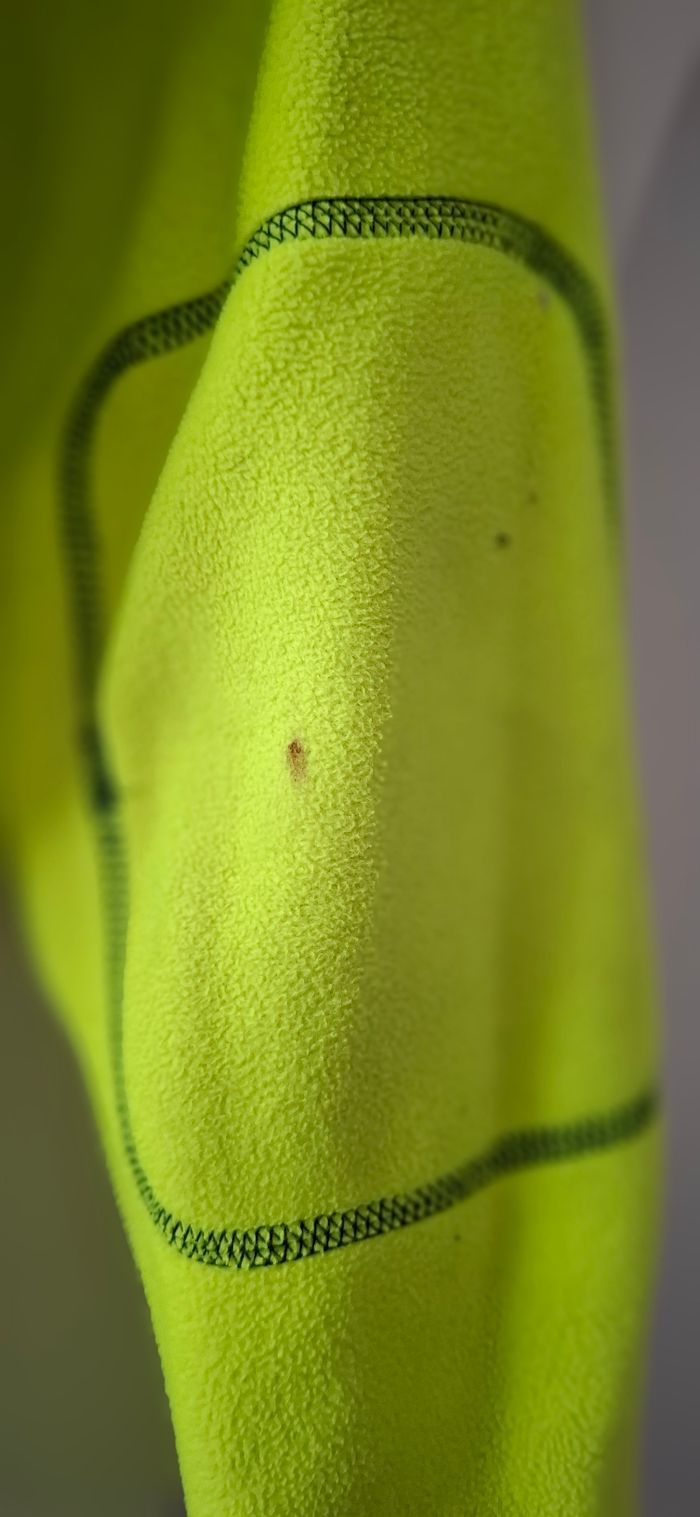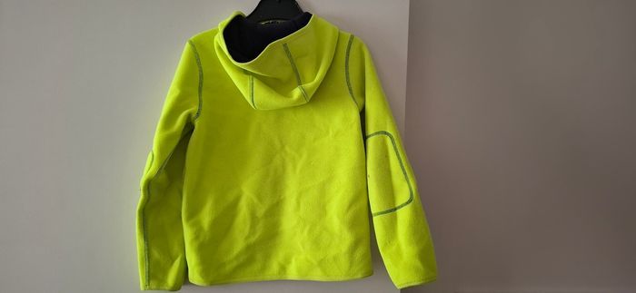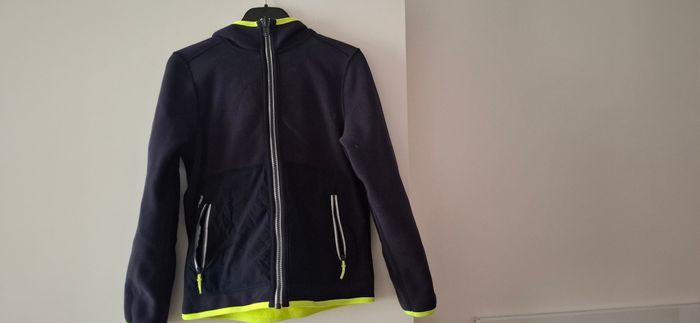 Veste polaire double face un côté jaune fluo et l'autre bleu marine taille juste bonne état excepté une toute petite tache sur la manche gauche face jaune fluo