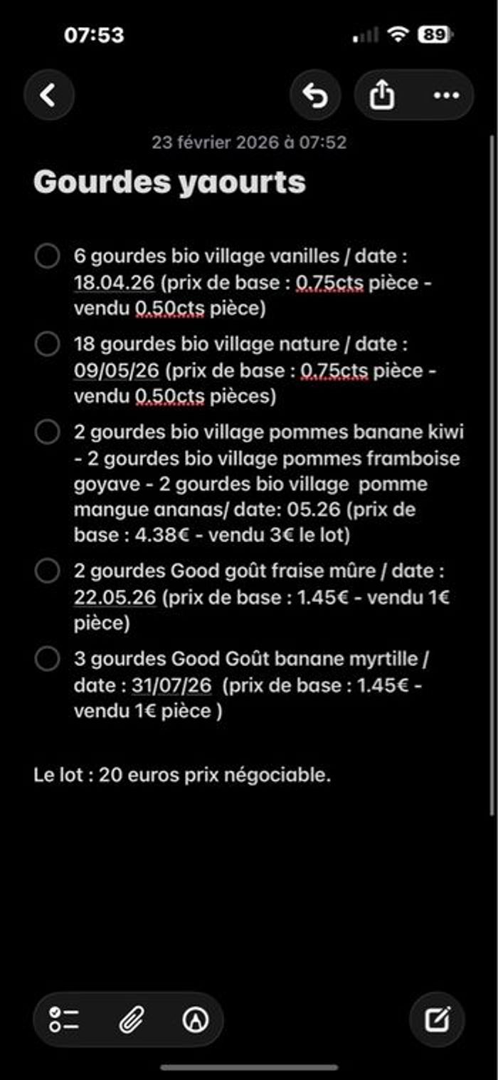 - [ ] 6 gourdes bio village vanilles / date : 18.04.26 (prix de base : 0.75cts pièce - vendu 0.50cts pièce) - [ ] 18 gourdes bio village nature / date : 09/05/26 (prix de base : 0.75cts pièce - vendu 0.50cts pièces) - [ ] 2 gourdes bio village pommes banane kiwi - 2 gourdes bio village pommes framboise goyave - 2 gourdes bio village pomme mangue ananas/ date: 05.26 (prix de base : 4.38€ - vendu 3€ le lot) - [ ] 2 gourdes Good goût fraise mûre / date : 22.05.26 (prix de base : 1.45€ - vendu 1€ pièce) - [ ] 3 gourdes Good Goût banane myrtille / date : 31/07/26 (prix de base : 1.45€ - vendu 1€ pièce ) Le lot : 20 euros prix négociable.