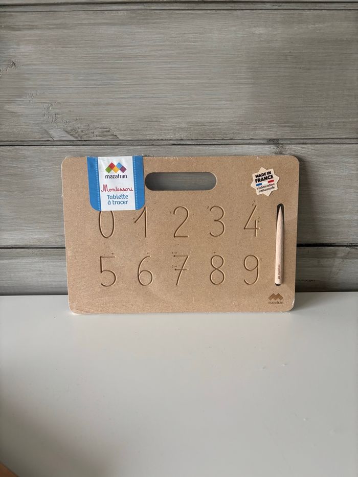 Tablette en bois d’écriture des chiffres Montessori de la marque Mazafran neuve 🙂 je la vends car je l’ai en double. N’hésitez pas pour des informations supplémentaires ! La tablette d'écriture mesure 29 x 19 cm et le stylet en bois mesure 10 cm de long.