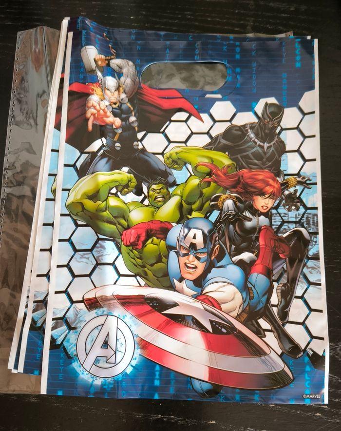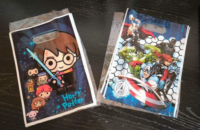 Lot de sacs à bonbons pour anniversaire : 5 sacs thème Harry Potter et 4 sacs thème Avengers, état neuf.