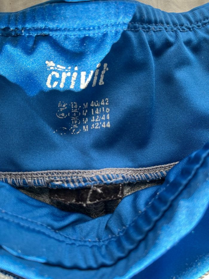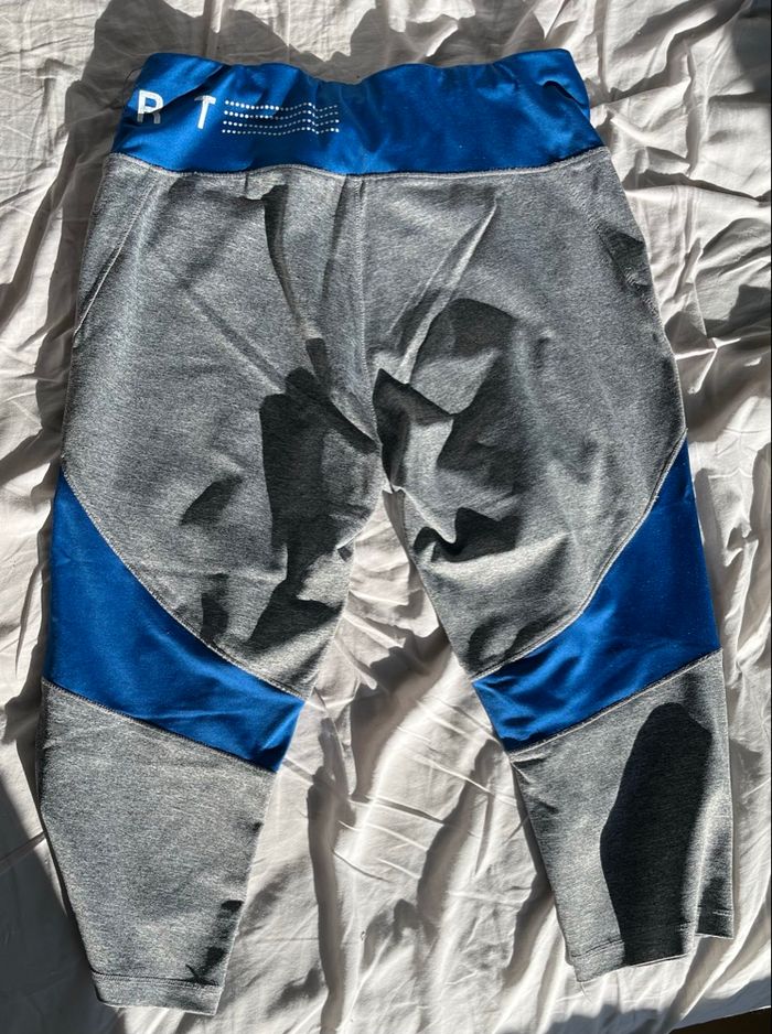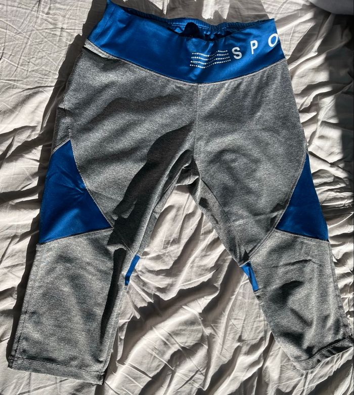Pantacourt de sport gris et bleu Écrit sport au niveau de la taille Marque : Crivit Taille : M 40/42
