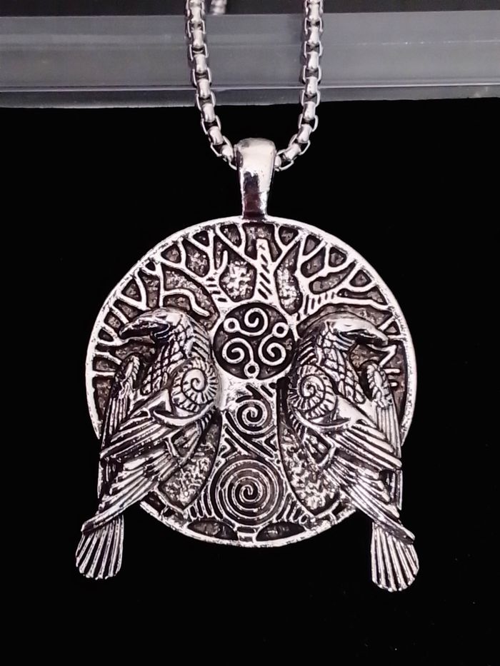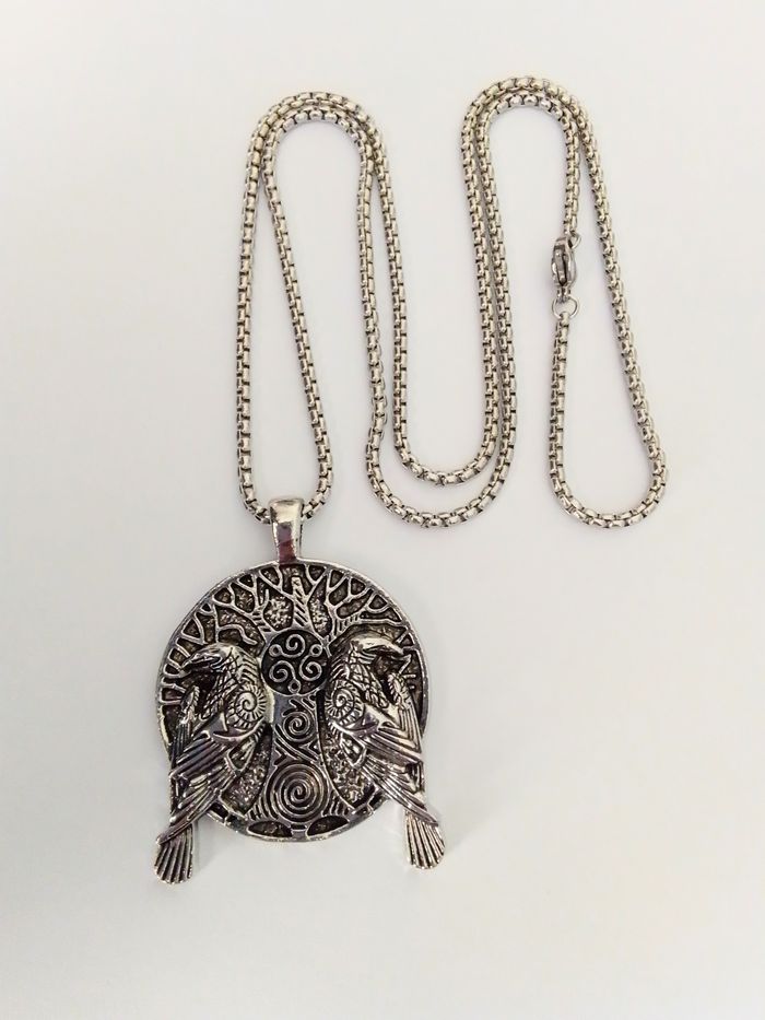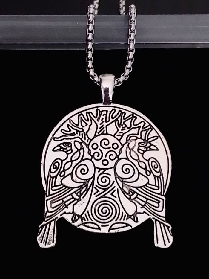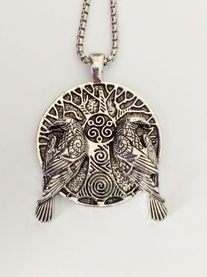 Chaîne + pendentif viking. Pendentif : viking nordique, corbeau, motif : arbre de vie. (viking, protection, spirituel, celtique, idéal cadeau) DESCRIPTIF : Pendentif double face. Couleur : argenté. Taille chaîne : 60 cm Diamètre pendentif : 3,7 cm L * 4,5 cm H. Envoi rapide et soigné.