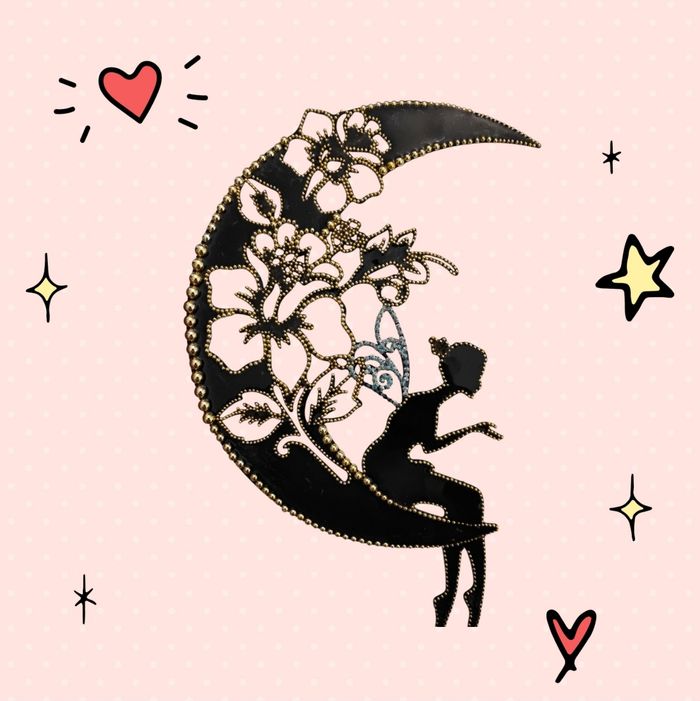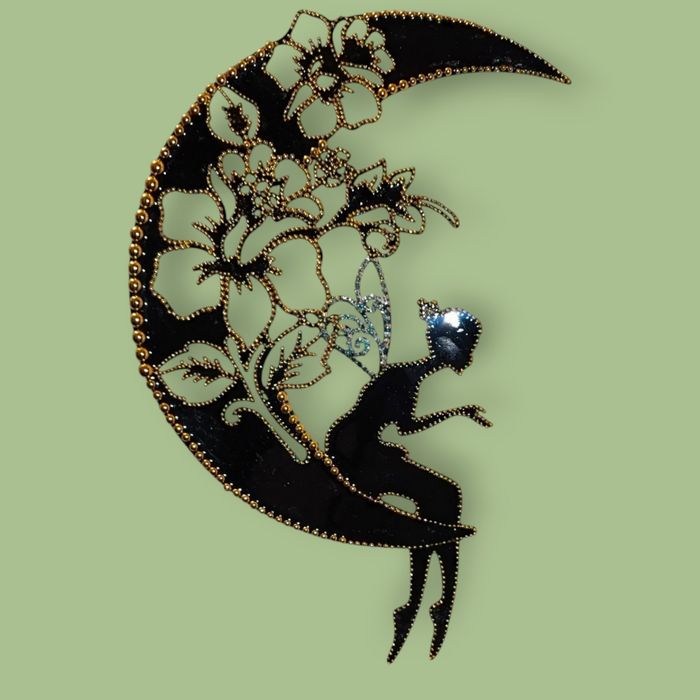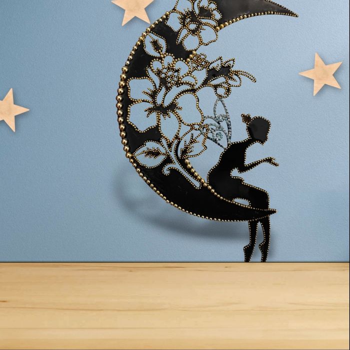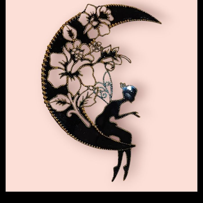 décoration murale artisanale unique. Cette œuvre représente une silhouette féminine délicate assise sur une lune, ornée de motifs floraux raffinés. Elle est sublimée par l’ajout de perles décoratives et d’une finition en résine, qui lui donnent du relief, de la brillance. Dimensions : 30 x 19 cm Fixation facile À l’arrière, un papier adhésif permet de coller directement la décoration sur : toute surface lisse ,mur , armoire,porte ..... Comme un sticker mural, mais amélioré et enrichi par des perles dorées et de la résine. #cadeau original #cadeau fille#piece unique #deco chambre #decoration maison