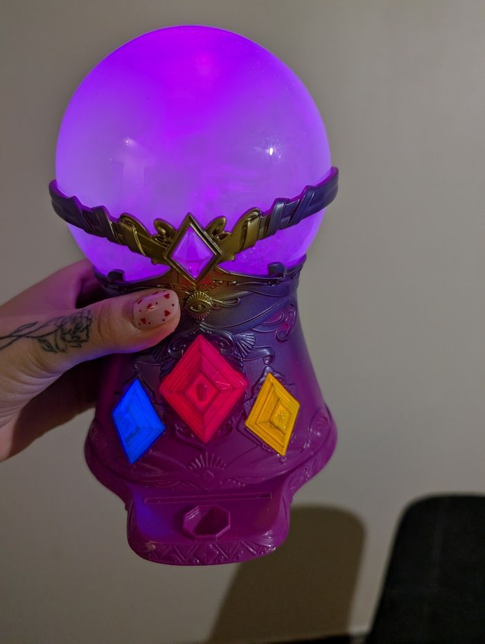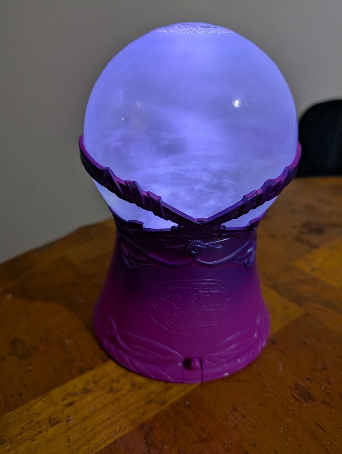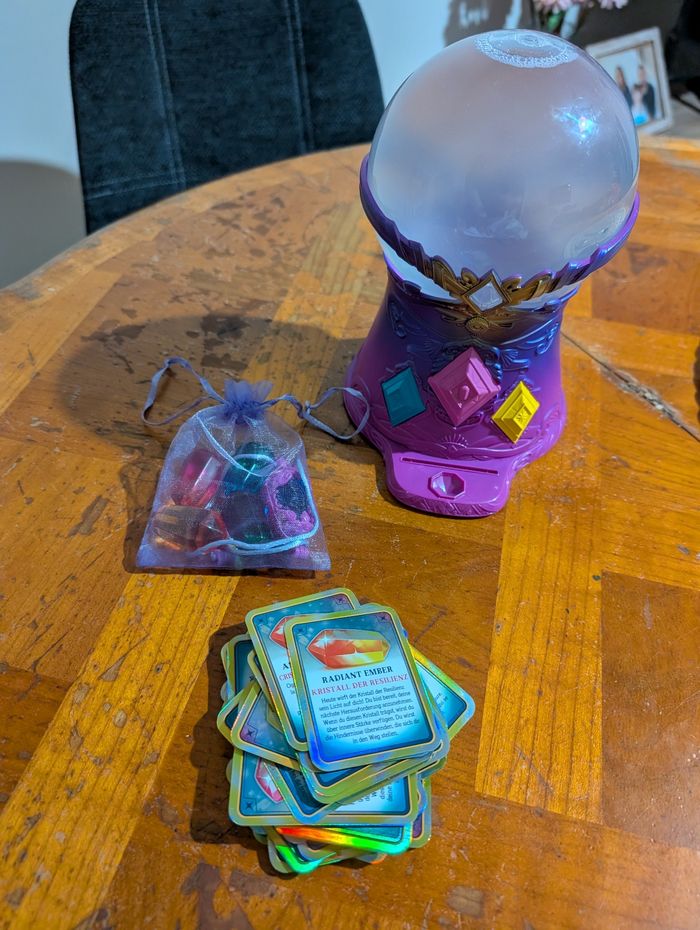 Bonjour Je vends cette boule de cristal en jouet crystal gaze en très bon état, ma fille n'a jamais joué avec elle n'accroche pas alors que sa soeur adore la sienne. Il y a des joyaux magiques, que vous pouvez mettre en collier, et les cartes explicatives (il en manque trois, une en français et les deux autres en je ne sais pas quelle langue) mais ne gêne pas l'imaginaire des enfants Les piles sont neuves donc elle s'allume, la fumeme tournoie et elle fait du bruit en fonction des questions réponses que vous pouvez lui poser sur l'aveni Possibilités de traces d'usure puisqu'il s'agit d'occasion voir photos vous achetez ce que vous voyez